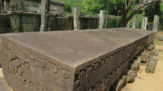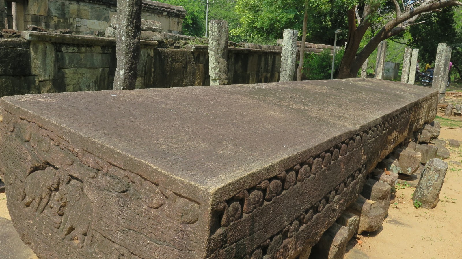 Por último, admiramos la gran piedra de 9 x 1,5 metros conocida como Gal Pota. Con más de 25 toneladas de peso, se trata de una piedra tallada con forma de libro en la que se narran las hazañas del rey Nissanka Malla.