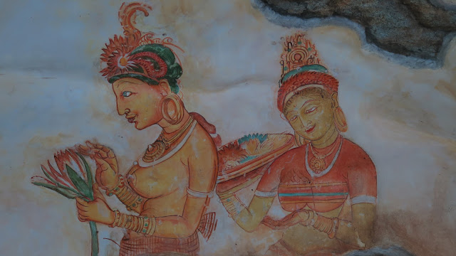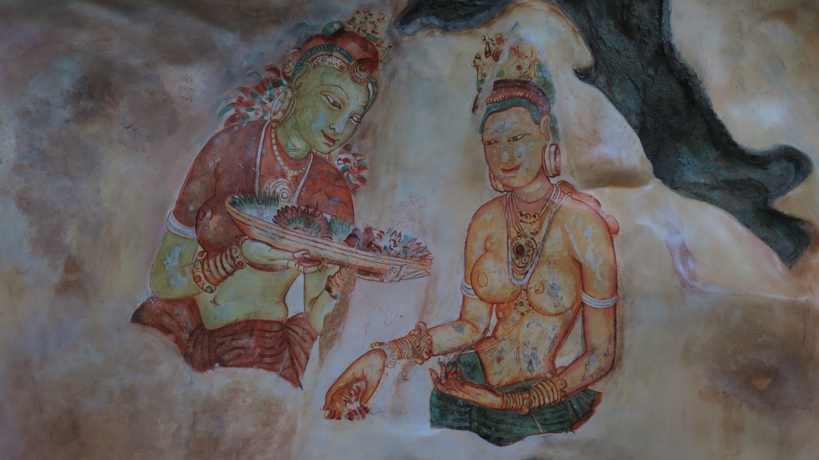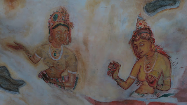 El Muro de Espejo: se trata de una pared extremadamente pulida, en la que podemos contemplar antiguas inscripciones que realizaban los visitantes tras contemplar los frescos de las doncellas desnudas. Dichas inscripciones datan de los siglos VI a XIV; aunque en la actualidad la pared ha sido bastante dañada por rayones y pintadas más modernas. La galería de las damas de Sigiriya: aunque estos espectaculares frescos pertenecen a una época distinta a la del palacio, son uno de los mayores reclamos de la visita. Se trata de unas excelentes pinturas que podrían haber cubierto gran parte de la cara este de la roca (se cree que una superficie de 140 x 40 metros), aunque en la actualidad se puede contemplar únicamente una pequeña parte, en la que se aprecian a varias doncellas con cintura de avispa y con el torso desnudo. Si bien todavía se especula con lo que representan los frescos, se cree que puede tratarse de ninfas o de figuras relacionadas con el budismo tántrico. No está permitida la fotografía en esta pequeña galería (podemos realizar las fotos pertinentes en la perfecta réplica del museo).