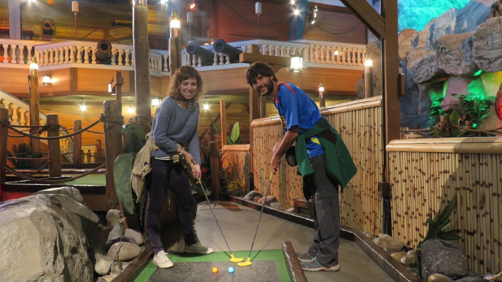 Llegamos a Santa Cruz de noche. Dejamos las cosas en el motel y salimos a pasear y cenar. Tomamos algo en la zona del puerto, algo alicaída; sin embargo, nosotros nos lo pasamos pipa jugando un rato al mini golf. Tras ello caminamos hasta el centro de la ciudad, donde hay algo más de ambiente en la «zona de bares», aunque vemos bastante gente rara que no nos inspira demasiada confianza. Quizá sea hora de ir a dormir.