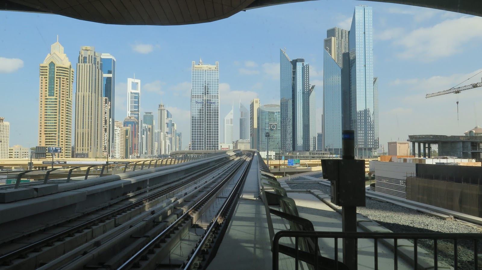 | Vista del centro financiero de Dubái, desde el primer vagón del metro. |