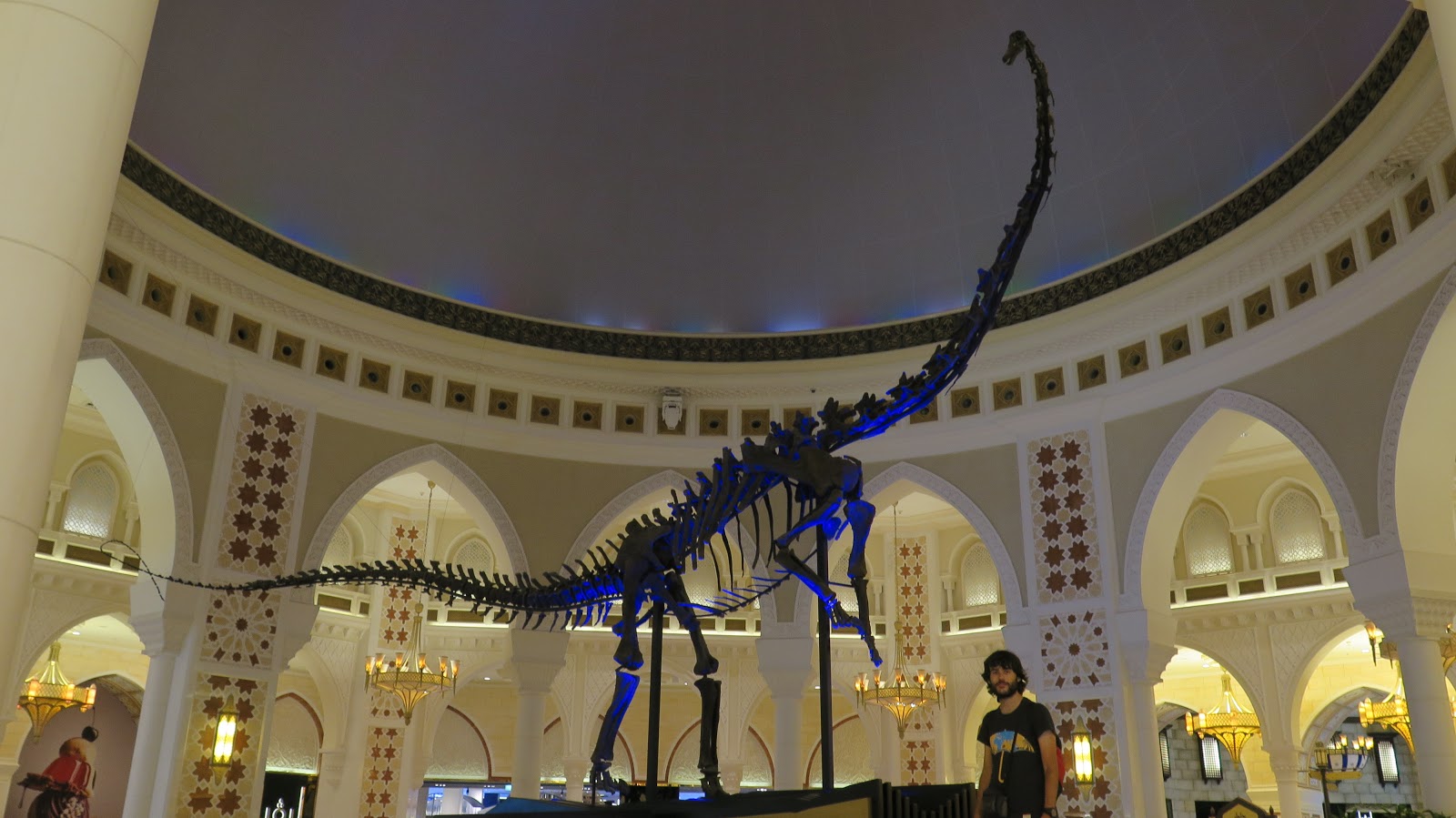 Paseamos boquiabiertos admirando todos los detalles del centro comercial. Visitamos la zona conocida “TheVillage”, así como el zoco; e incluso nos tomamos una fotografía con un enorme esqueleto de dinosaurio que decora uno de los pasillos. Nos parece increíble.