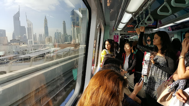 Tenemos que montar en la línea roja en dirección a UAE Exchange, y bajarnos en la parada de Burj Khalifa/Dubai Mall, lo cual nos cuesta unos 20-25 minutos. En el metro viajan personas de todas las nacionalidades; y hay que tener en cuenta que hay algunos vagones únicamente para mujeres, lo que se respeta estrictamente y puede haber multas a los hombres que entren. También llama la atención que el metro es completamente autónomo (no hay conductor).