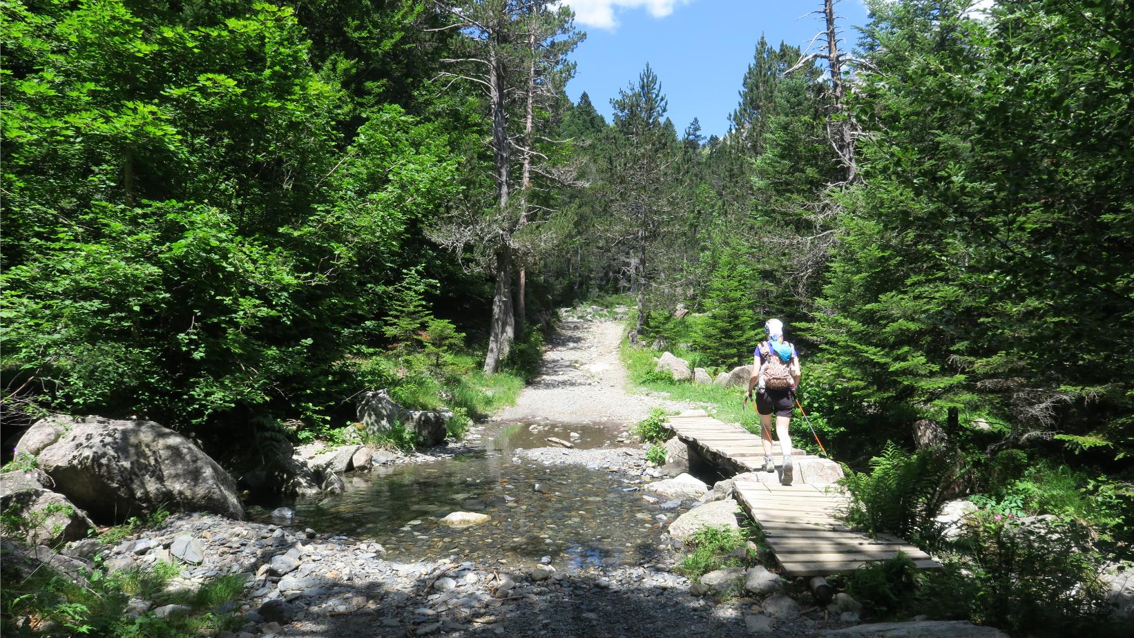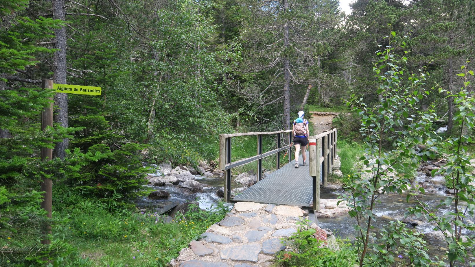 Siempre con tendencia ascendente, vamos avanzando hasta llegar a la Palanca de Batisielles (4,7 km; 1 hora y 25 minutos; 1598 metros), pequeño puente que nos permite atravesar las aguas procedentes de la Aigüeta de Batisielles. Estratégicamente situado a la sombra, un banco nos aguarda para descansar unos minutos y aprovechar para reponer energías.