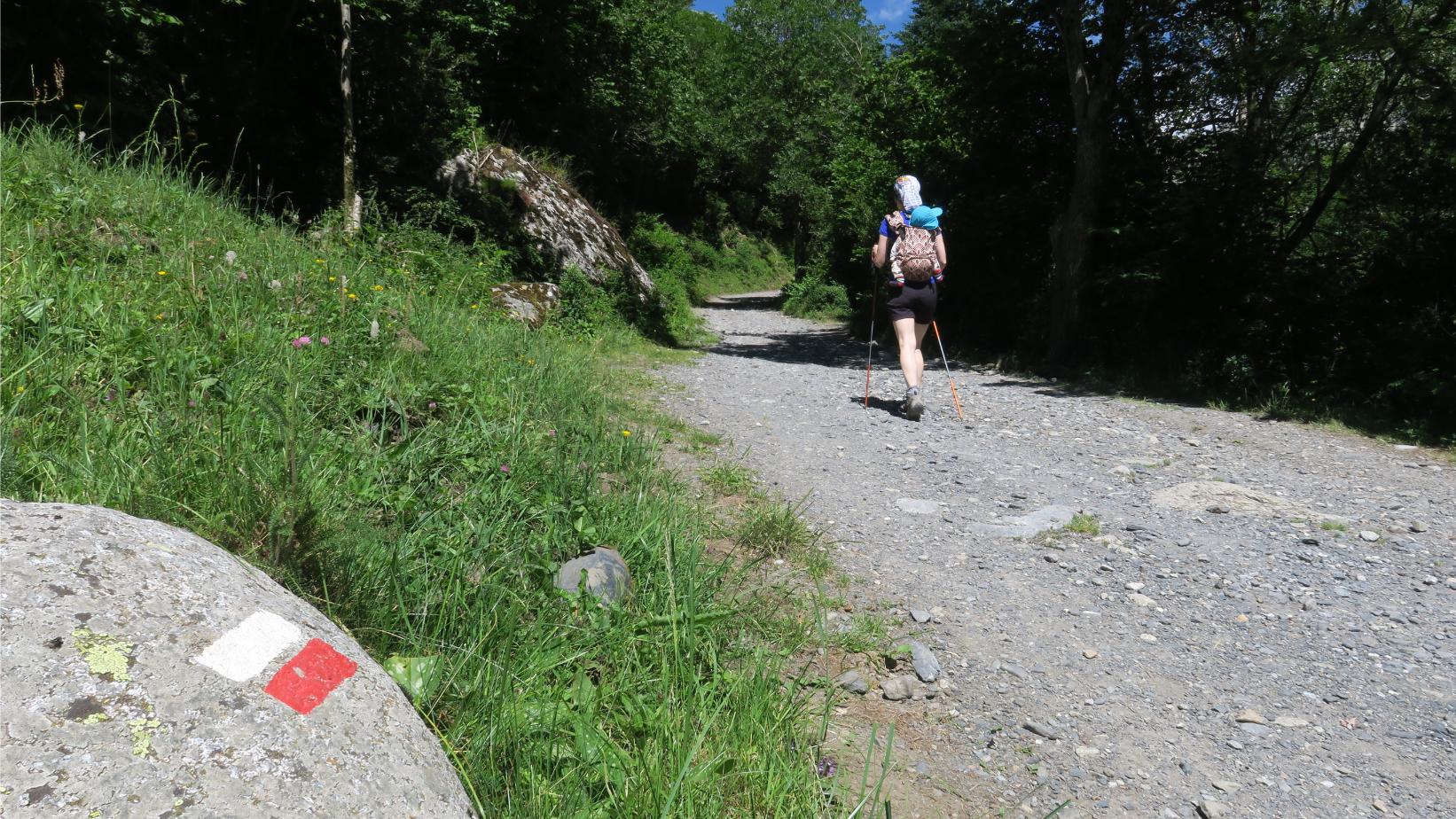 Tras unos veinte minutos de descanso decidimos continuar la marcha, siguiendo por la pista que asciende poco a poco, serpenteando entre majestuosos árboles. Caminar por aquí resulta agradable, aunque el sol veraniego comienza a calentar quizá algo más de la cuenta, por lo que agradecemos las sombras.