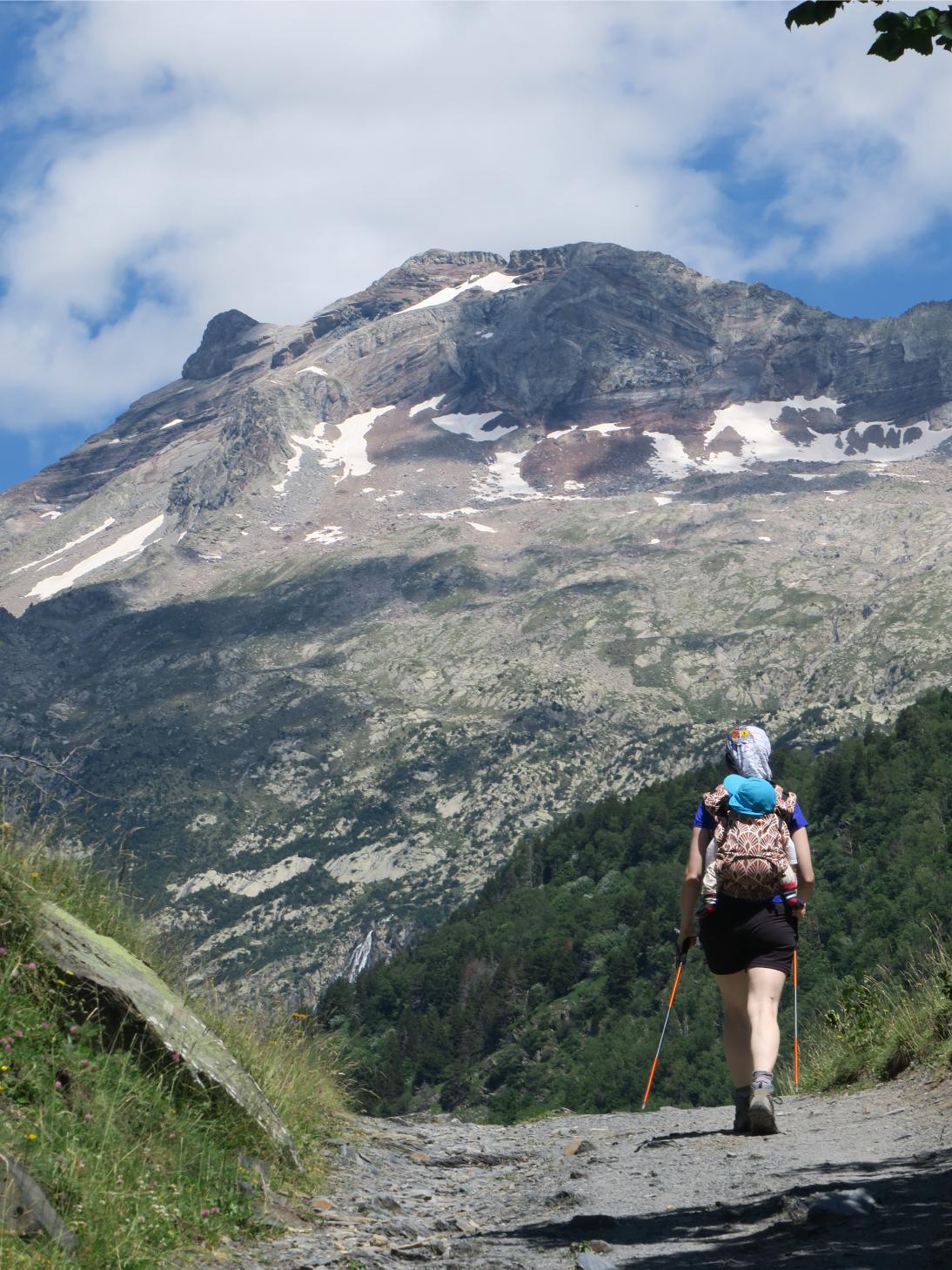 Decidimos buscar una sombra (escasas) por allí, y la hallamos bajo un gran árbol situado a la izquierda de la misma. Tranquilos, y disfrutando del entorno, nos quedamos algo más de una hora. Comemos, bebemos, descansamos y, sobre todo, contemplamos las excelsas panorámicas que ante nosotros se encuentran. Tomamos, también, decenas de fotografías. Hemos subido con el bebé porteado, y aunque se trata de una ruta larga, bien protegido del sol y caminando a ritmo tranquilo hemos podido llegar sin dificultad alguna.