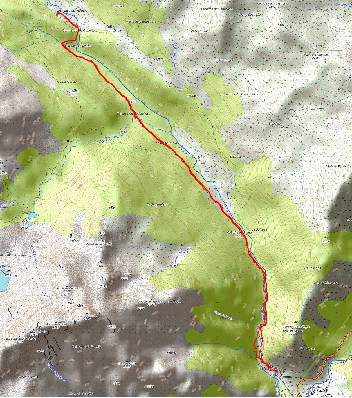 Itinerario: aparcamiento – Palanca de l’Aiguacari – Cabaña de Santa Ana – Palanca de Batisielles – Cabaña del Turmo – Palanca de Batisielles – Cabaña de Santa Ana – Palanca de l’Aiguacari – aparcamiento. .