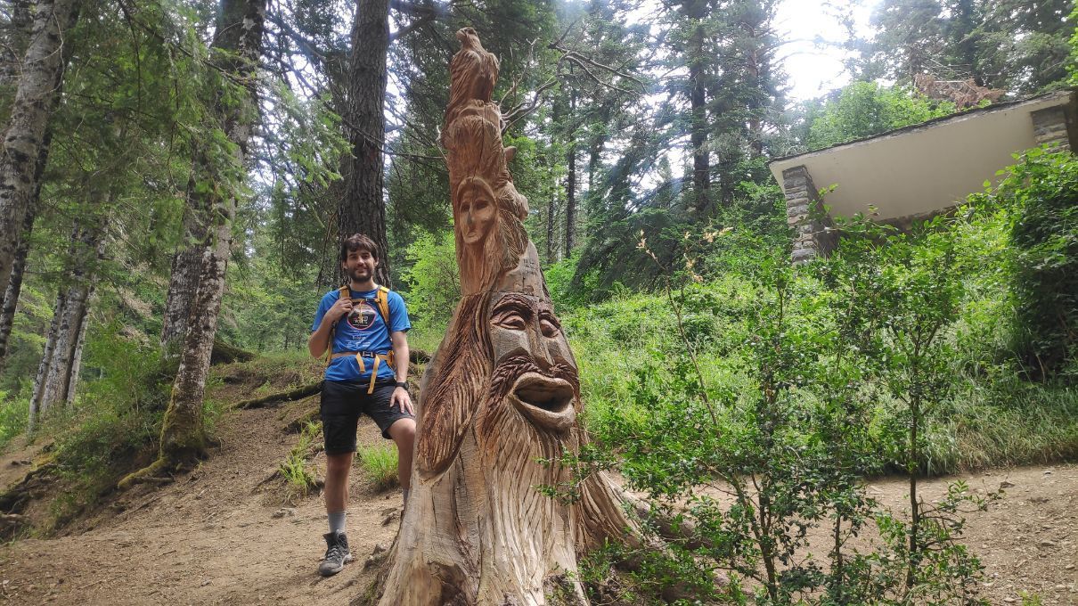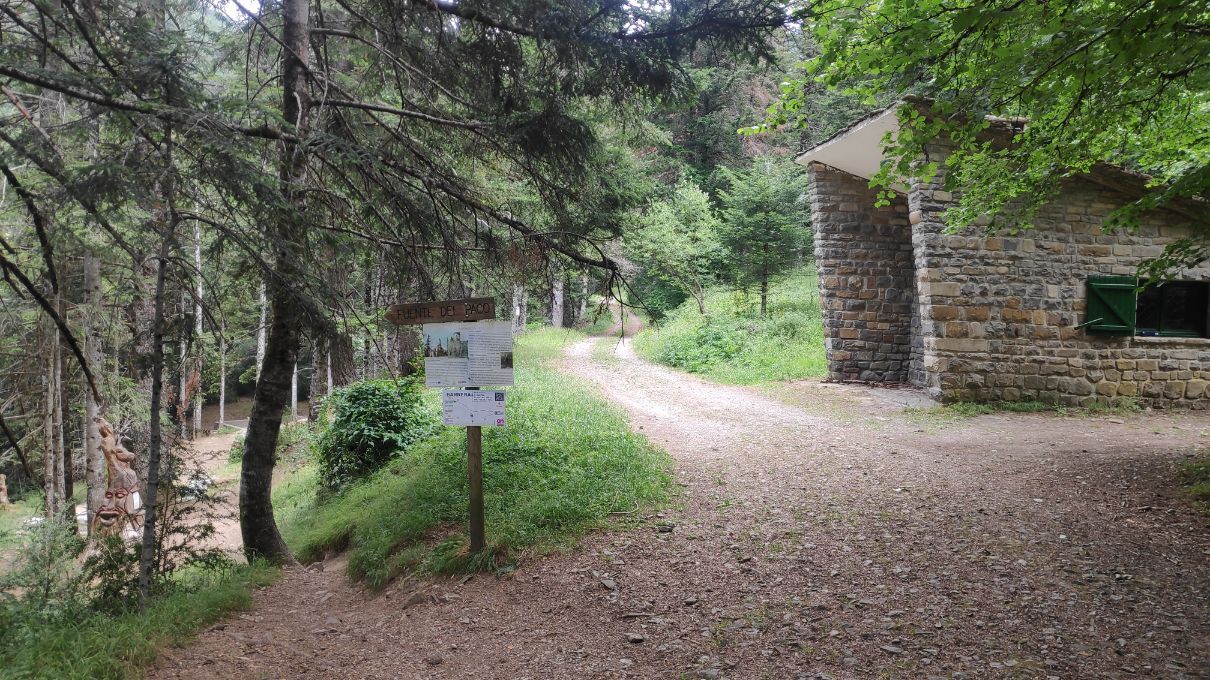 Llaneando o en suave ascenso alcanzamos el entorno de la Fuente del paco (2,7 km; 45 minutos; 1217 metros), donde hay un pequeño refugio, un espectacular tronco de madera tallado con figuras zoomórficas y un cartel informativo, siempre interesante y que merece la pena leer. Así, sabremos que el nombre de la fuente que visitamos se debe a que se halla en una ladera umbría (paco, en aragonés).