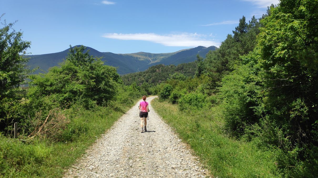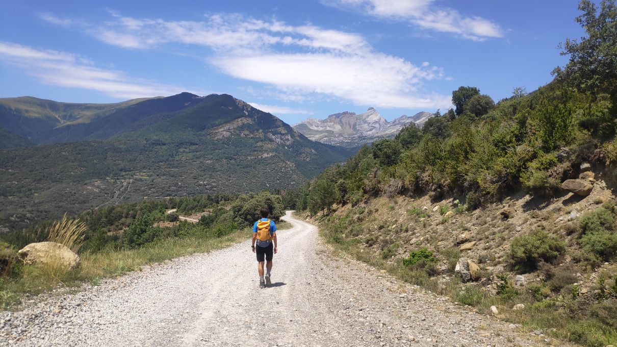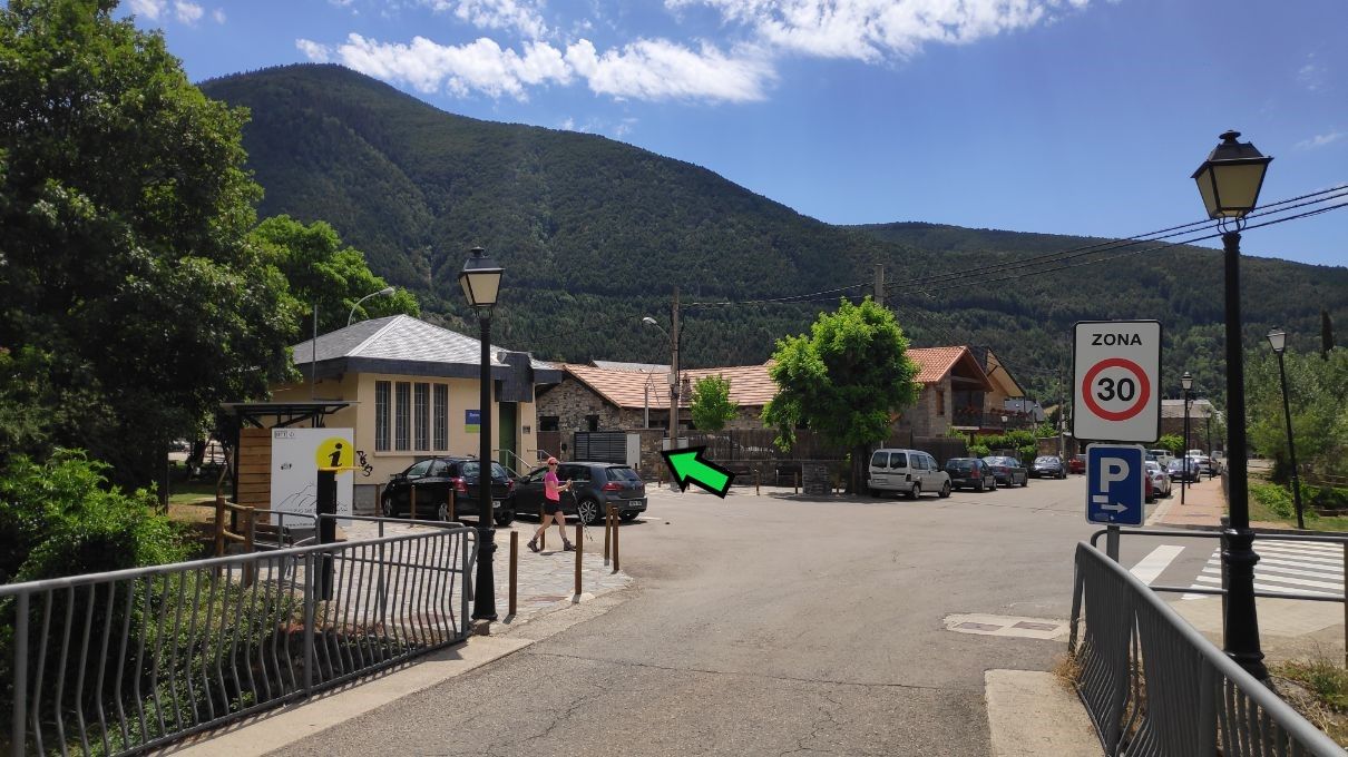Caminamos en claro ascenso junto a las últimas casas de la población y pasando junto al Albergue de Villanúa, hasta pronto toparnos con el desvío al antiguo Camino de la Selva (0,7 km; 10 minutos, 1011 metros de altitud).