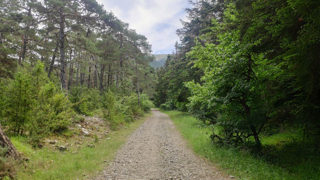 Aunque podríamos regresar por el camino de ida, optamos por realizar la ruta circular, por lo que volvemos a la pista para continuar por ella todavía un poco más en ligero ascenso, serpenteando por el magnífico bosque de pinos y abetos.