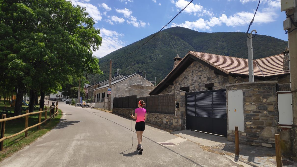 De regreso a la pista vamos perdiendo altitud progresivamente, teniendo la población de Villanúa cada vez más cerca. Un par de cerradas curvas nos llevan a las afueras de la población, justo en el punto donde antes habíamos tomado el inicio de la senda. Nos queda, tan solo, descender la asfaltada Avenida de la Selva para llegar de nuevo al coche.