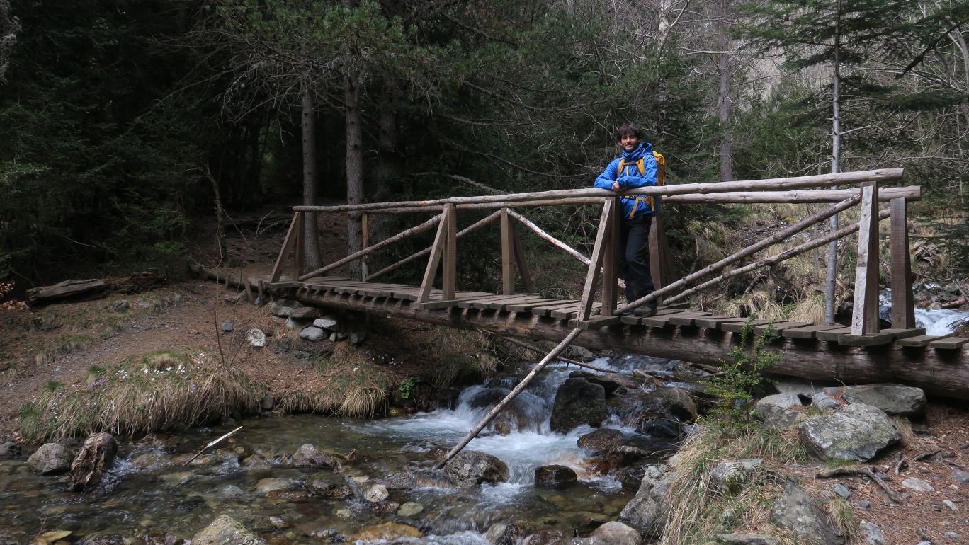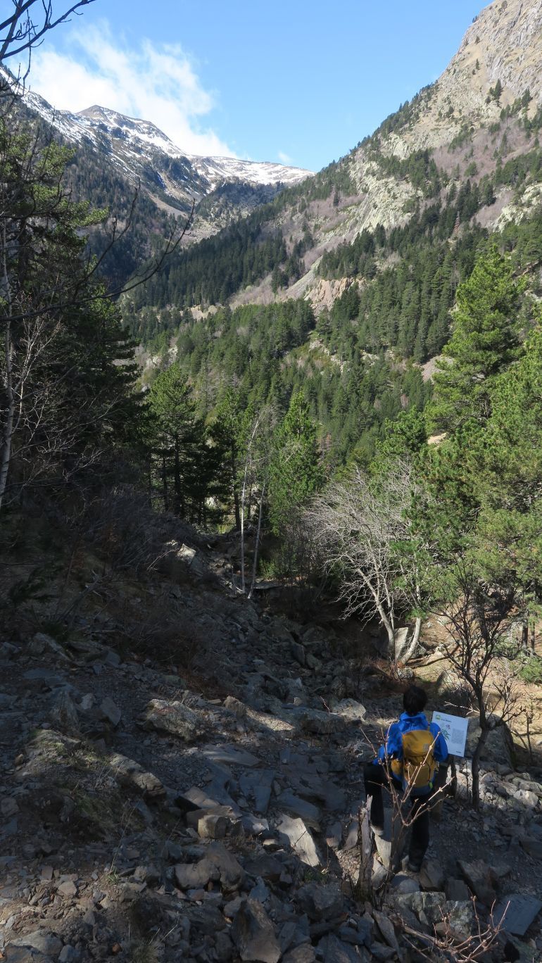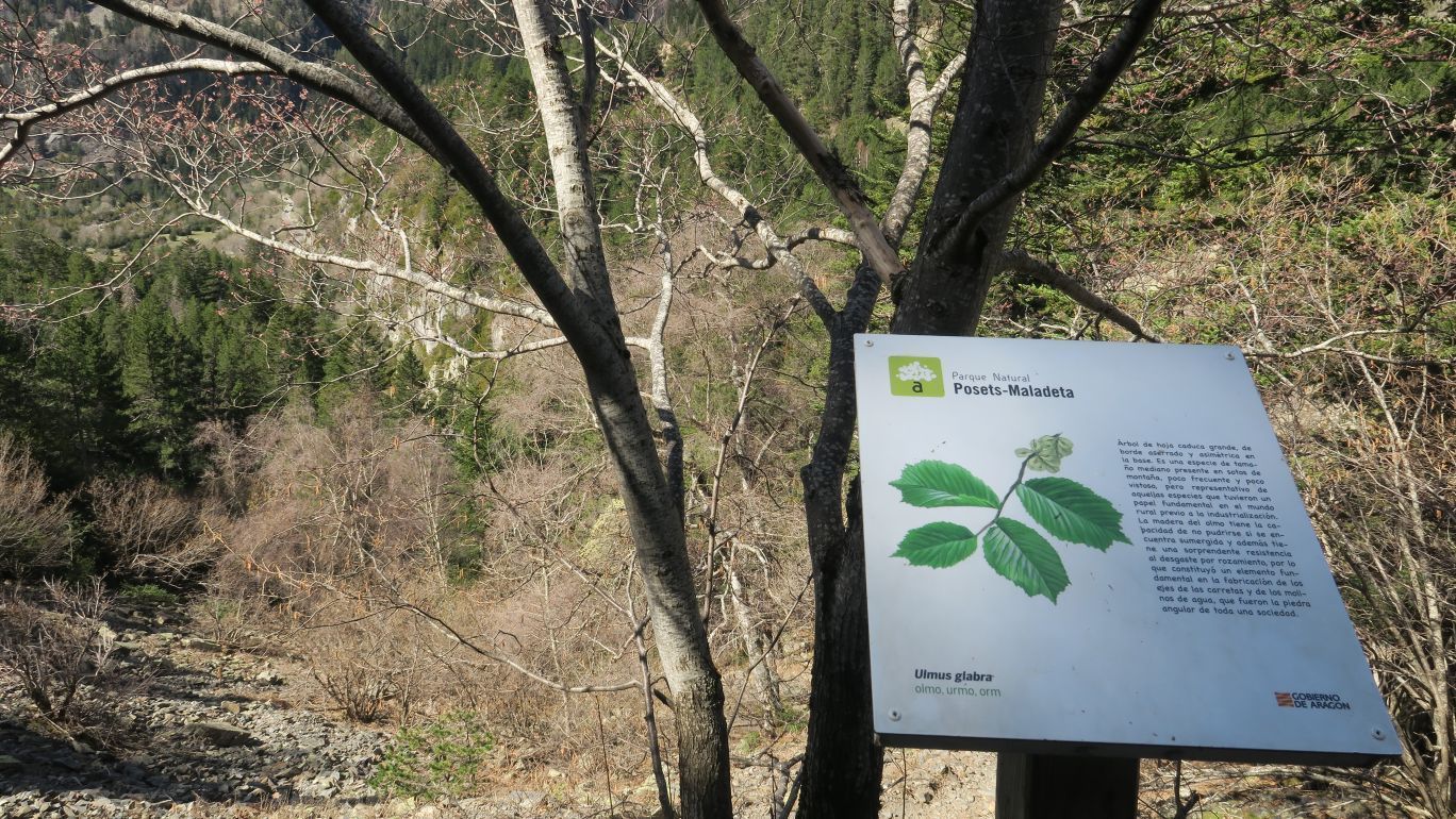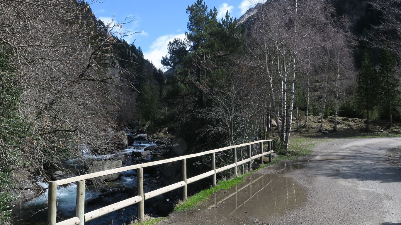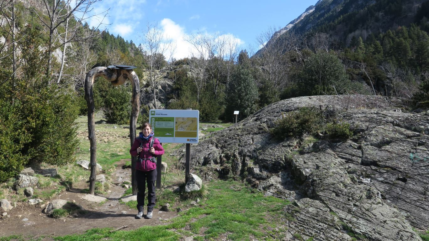 Cruzamos por un puente sobre el Río Ésera, que baja caudaloso en este atípico y caluroso comienzo de primavera. Pasado dicho puente, un panel explicativo nos describe la ruta de manera somera, junto a una suerte de puerta de madera que supone el verdadero inicio del sendero S-1.