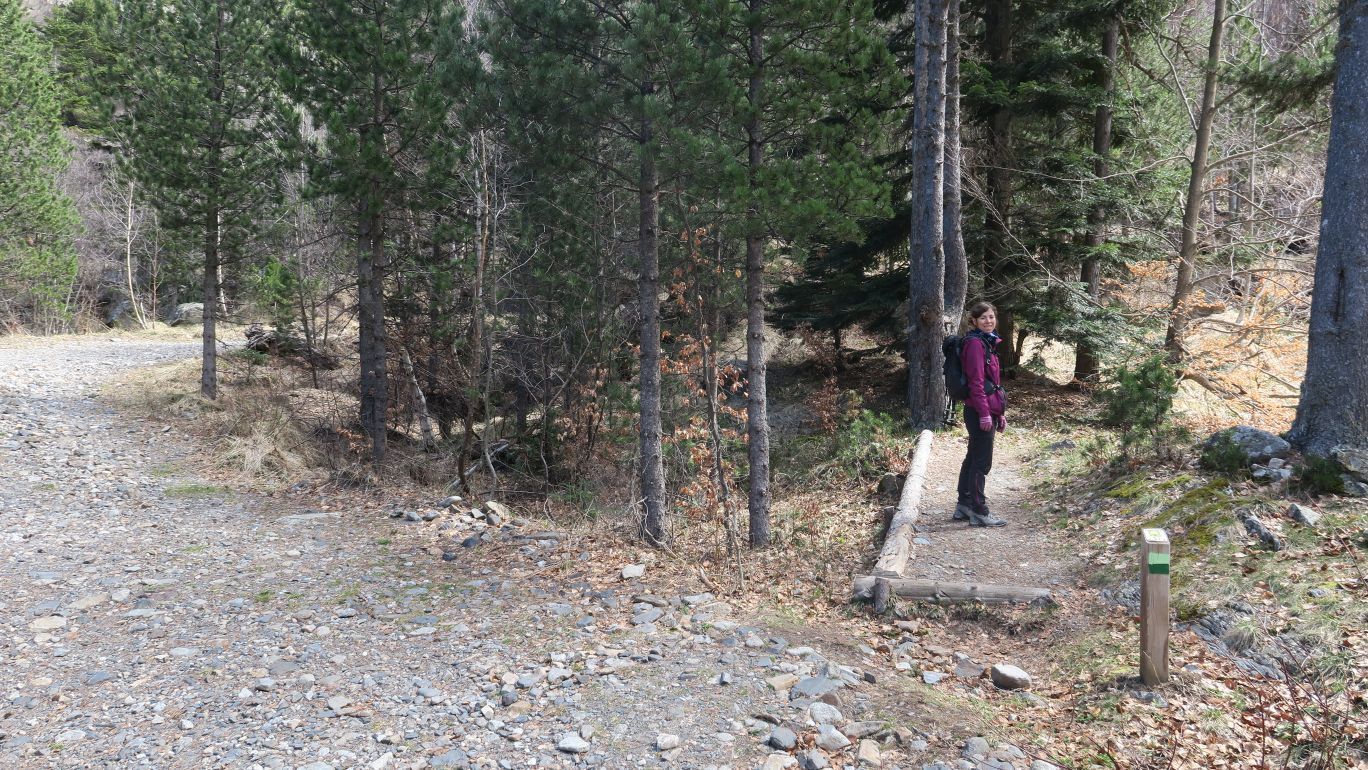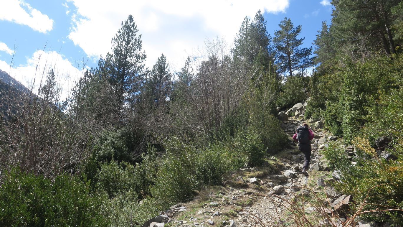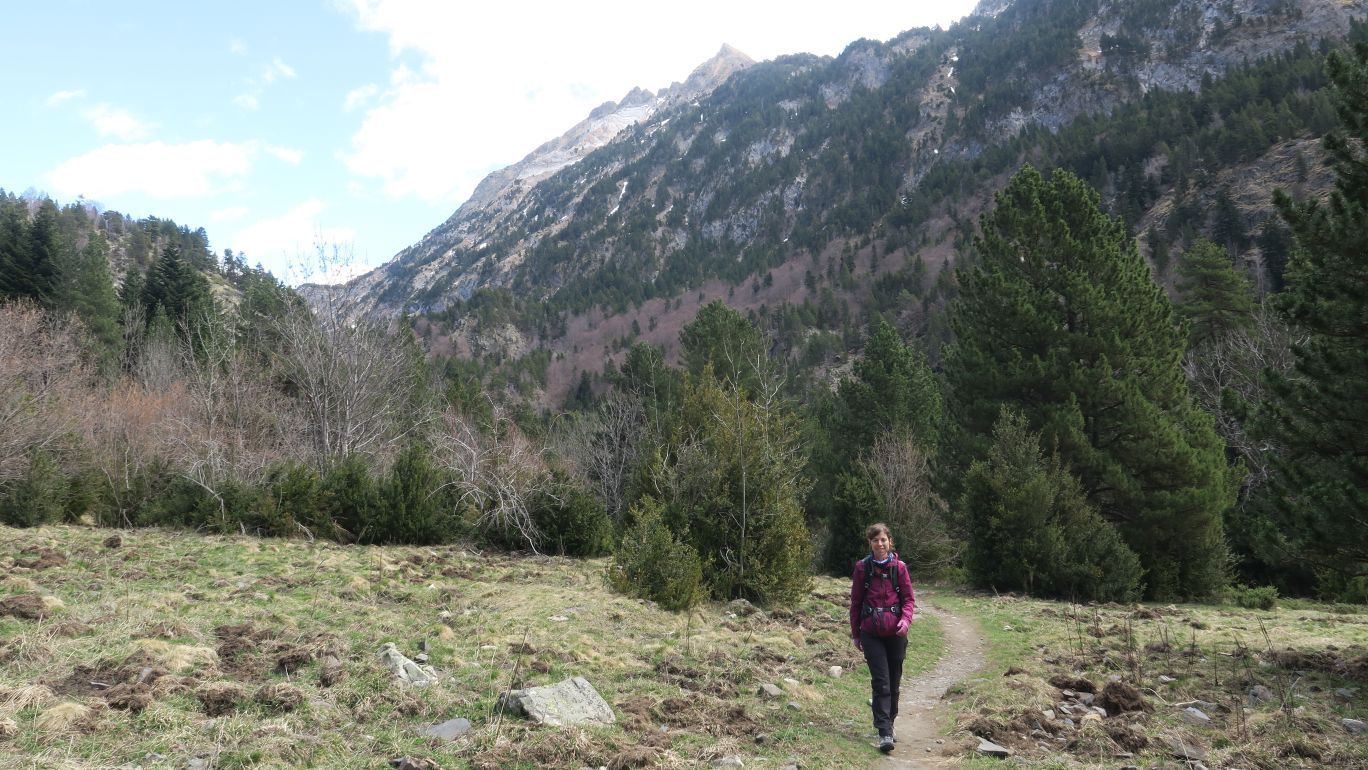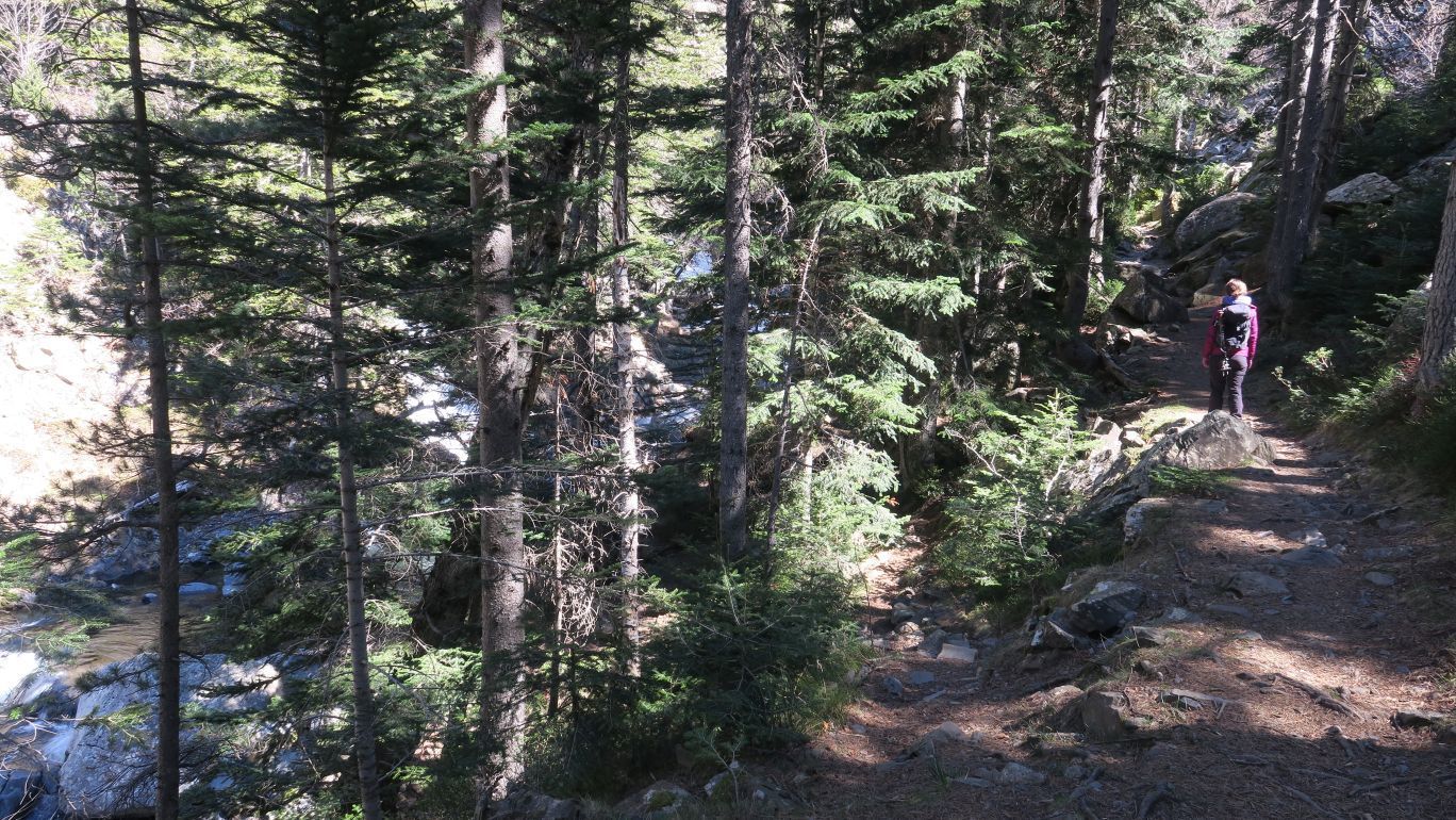 Pronto la senda comienza a ganar pendiente, siempre bien definida y señalizada, cada pocos metros, por marcas verde claro y verde oscuro. Nos dirigimos rumbo este por la margen izquierda del Río Ésera, ascendiendo paralelos al mismo.