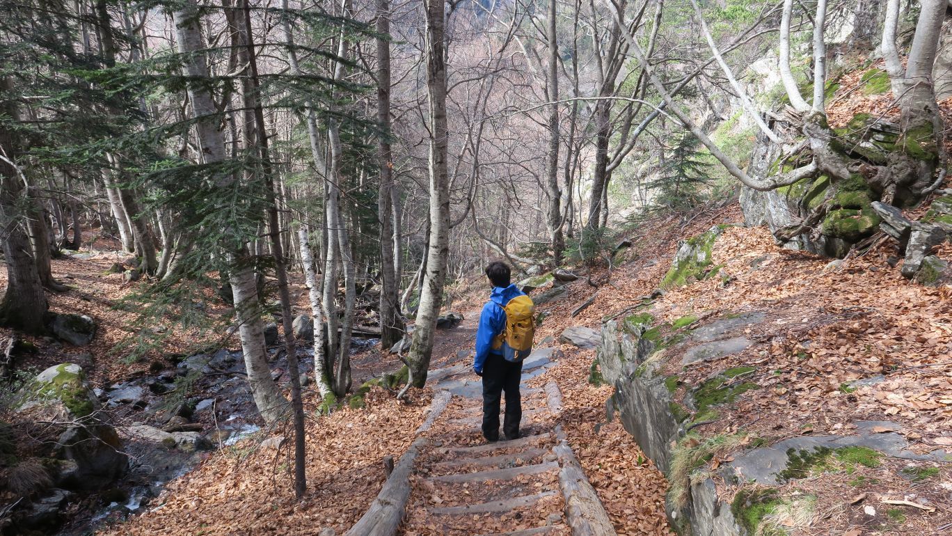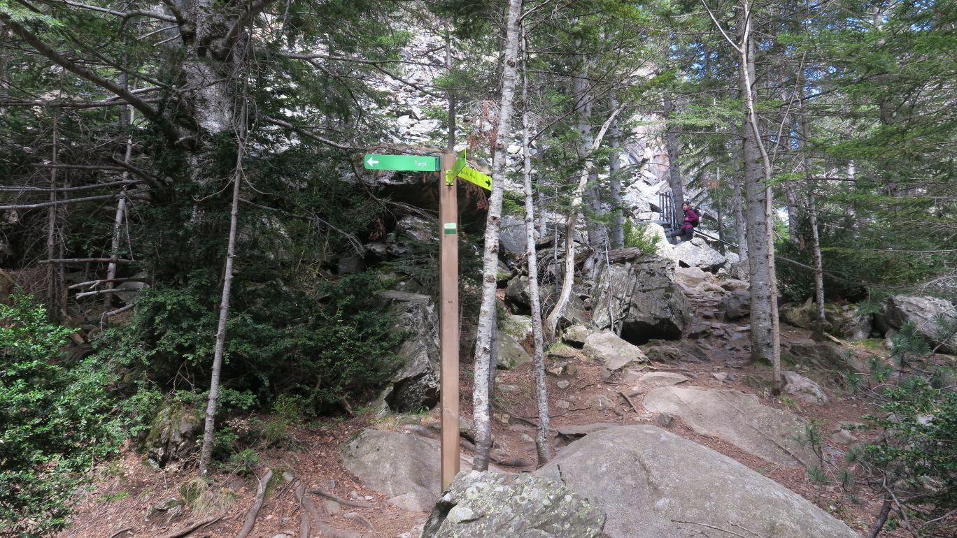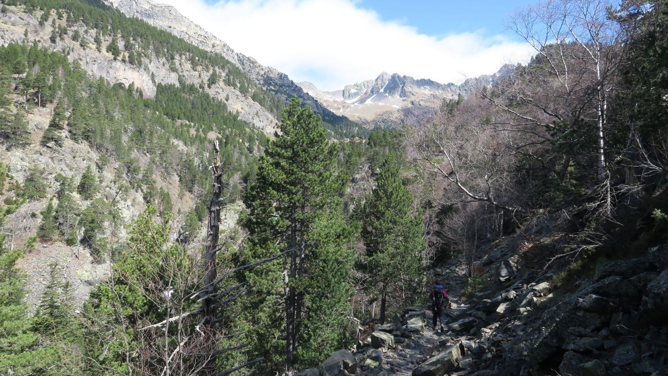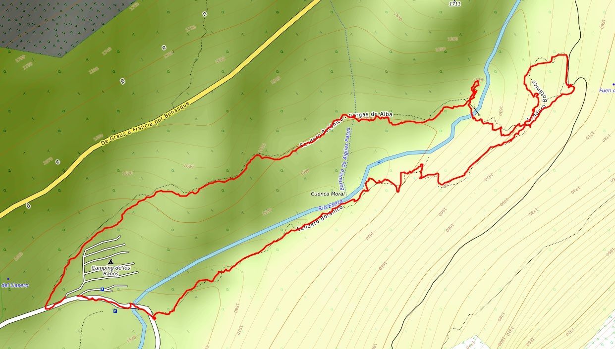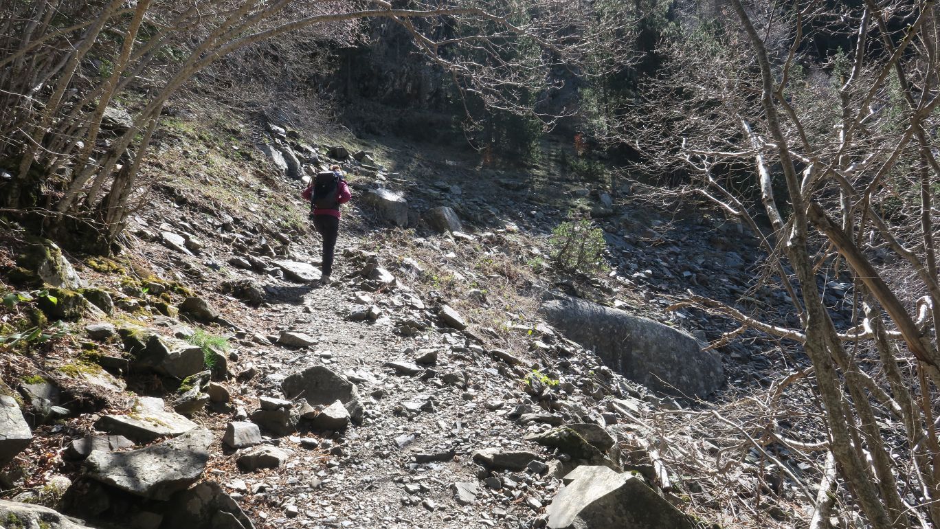 Pronto la senda comienza a ganar pendiente, siempre bien definida y señalizada, cada pocos metros, por marcas verde claro y verde oscuro. Nos dirigimos rumbo este por la margen izquierda del Río Ésera, ascendiendo paralelos al mismo.
