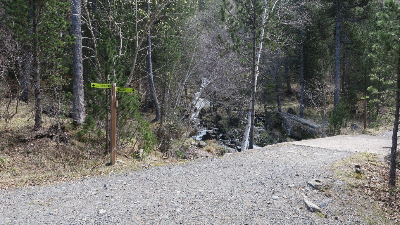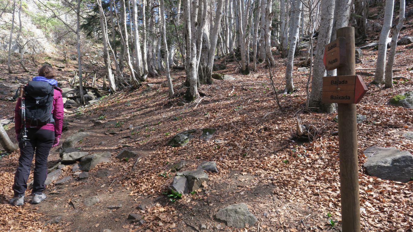 De este modo, continuamos de frente, para internarnos en el corazón del hayedo. Pronto unos carteles nos indican el punto donde comienza y finalizará el bucle entre las hayas. Siguiendo las indicaciones, ascendemos por la izquierda, atravesando un par de riachuelos mediante pasarelas de madera y llegando, en unos minutos, a la parte más alta del hayedo, justo donde el sendero se topa con la pista que llevaría al Hospital de Benasque.
