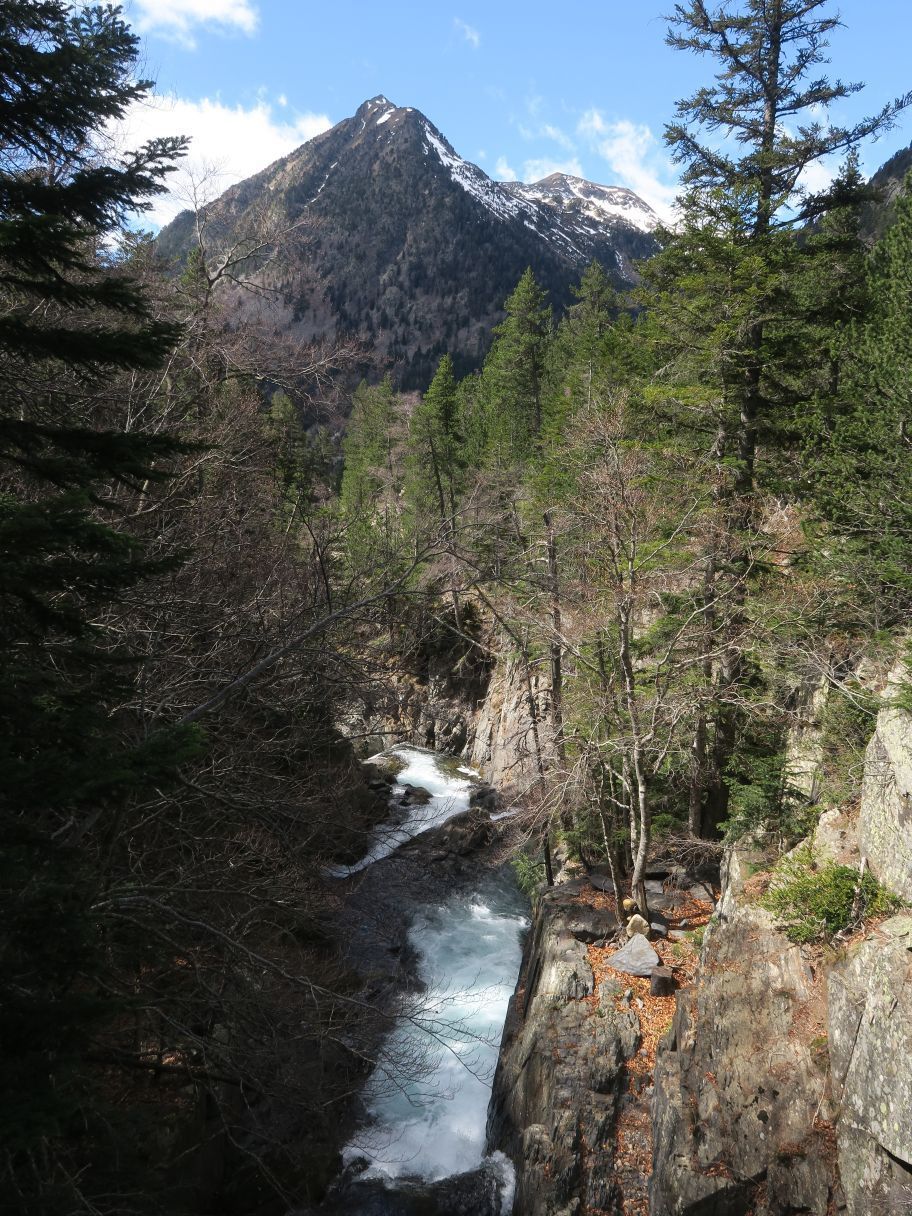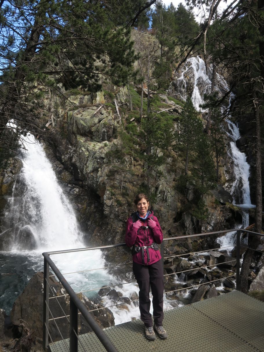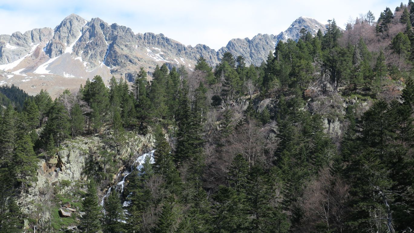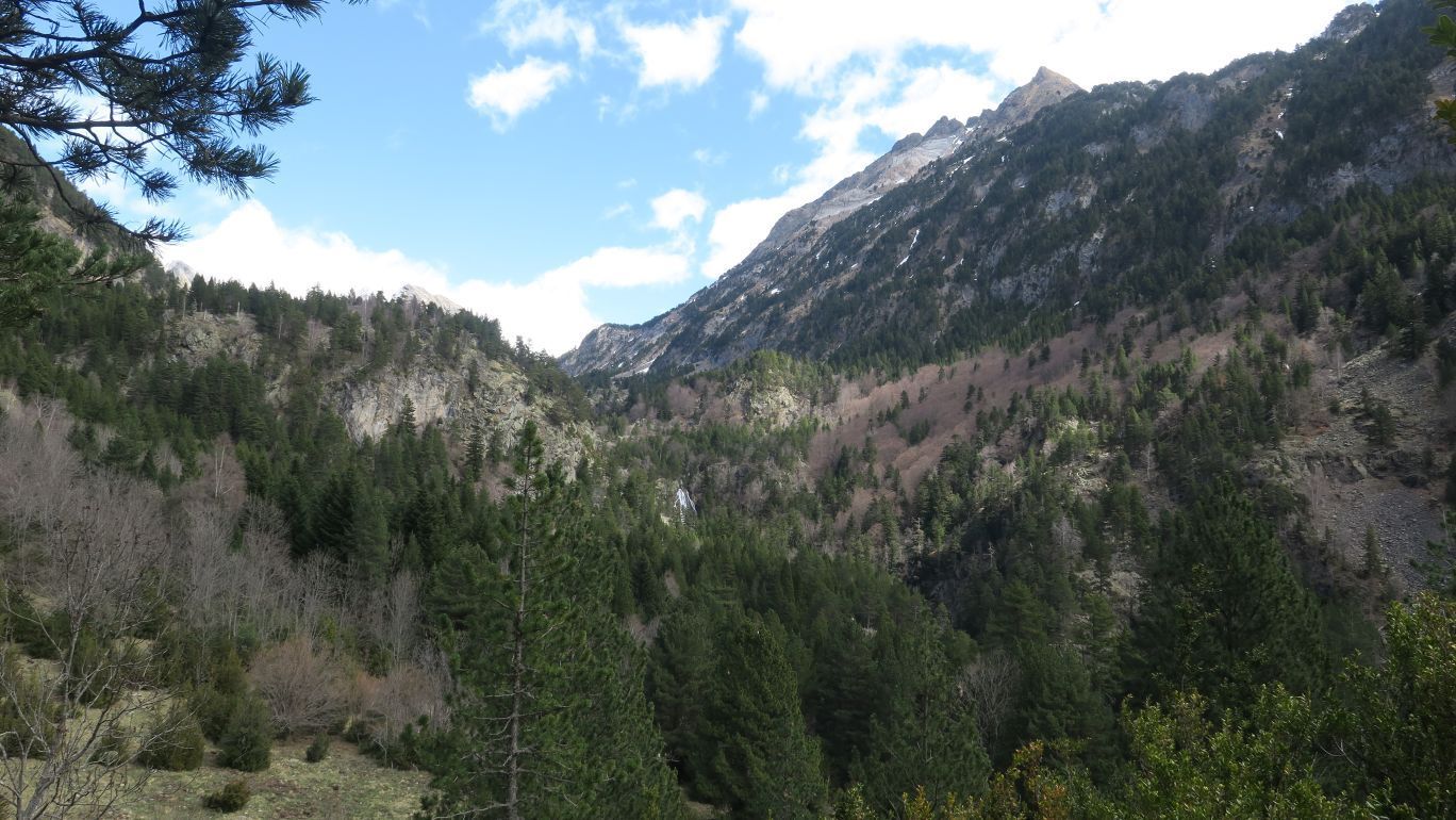 Pero enseguida la senda se aparta del río y comienza a ganar más pendiente todavía, llevándonos enseguida a un mirador (0,87 km; 22 minutos; 1615 metros de altitud). Desde este punto se observa parcialmente una de las cascadas, destacando también al fondo las cumbres de la Tuca de Salvaguardia (2738 m) y de la Tuca de la Montañeta (2558 m).