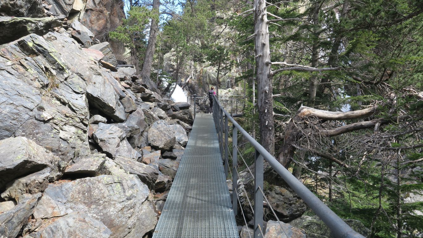 Finalizamos el bucle y pronto llegamos, de nuevo, al desvío principal de la ruta. Ahora sí, retomamos el S-1 que desciende por el bosque y no tarda mucho en llegar a un espectacular puente sobre el río, que permite obtener buenas panorámicas de las cascadas y la profunda garganta que han creado las aguas furiosas.