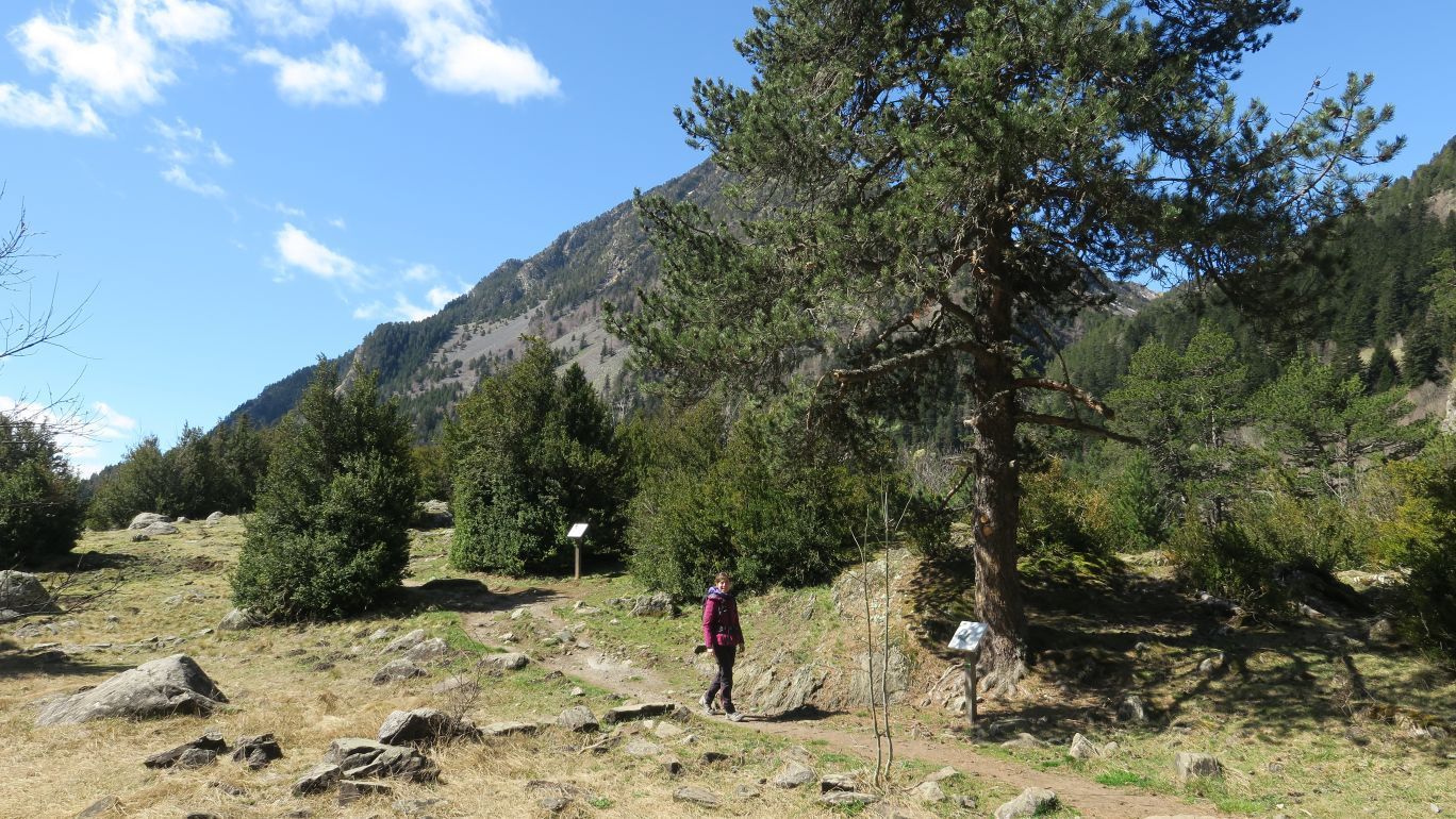 Los primeros metros del sendero serpentean, llaneando, por un terreno boscoso, en el que nos detenemos varias ocasiones a leer los paneles informativos del sendero botánico. Boj y pino negro son los primeros ejemplares detallados en la ruta; no obstante la lista a lo largo de la senda es amplia y resulta muy gratificante aprender un poco más de lo que se va viendo mientras se camina.