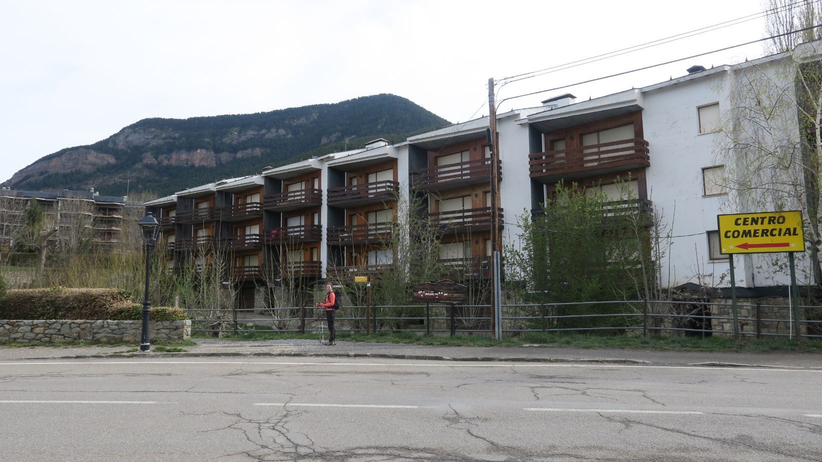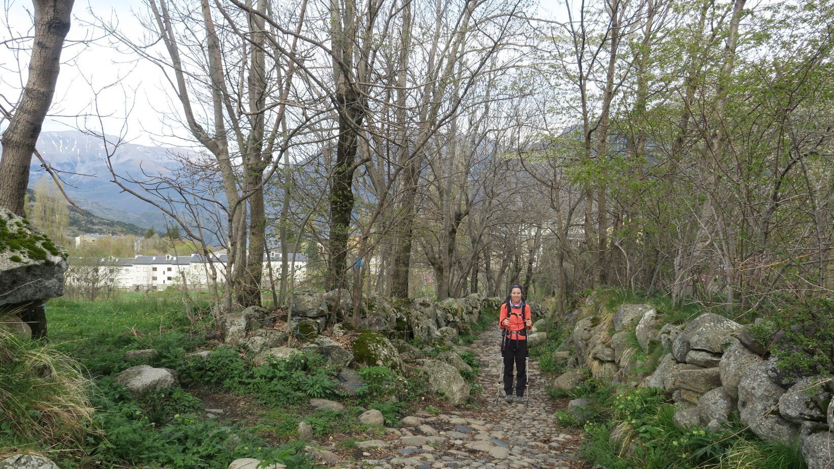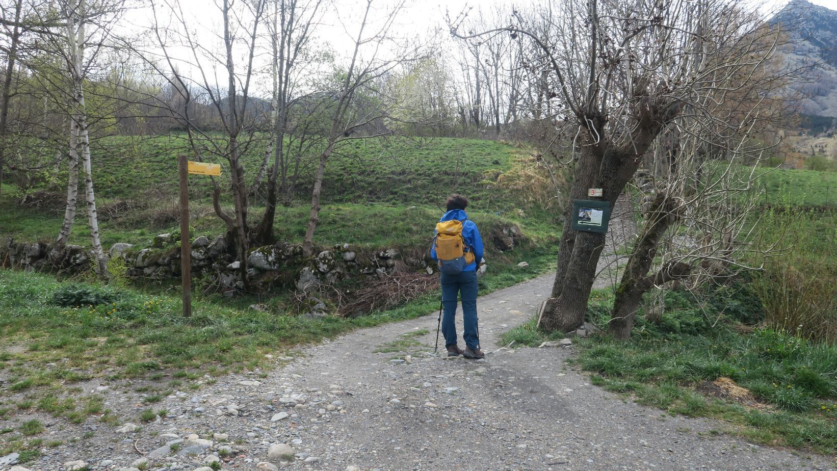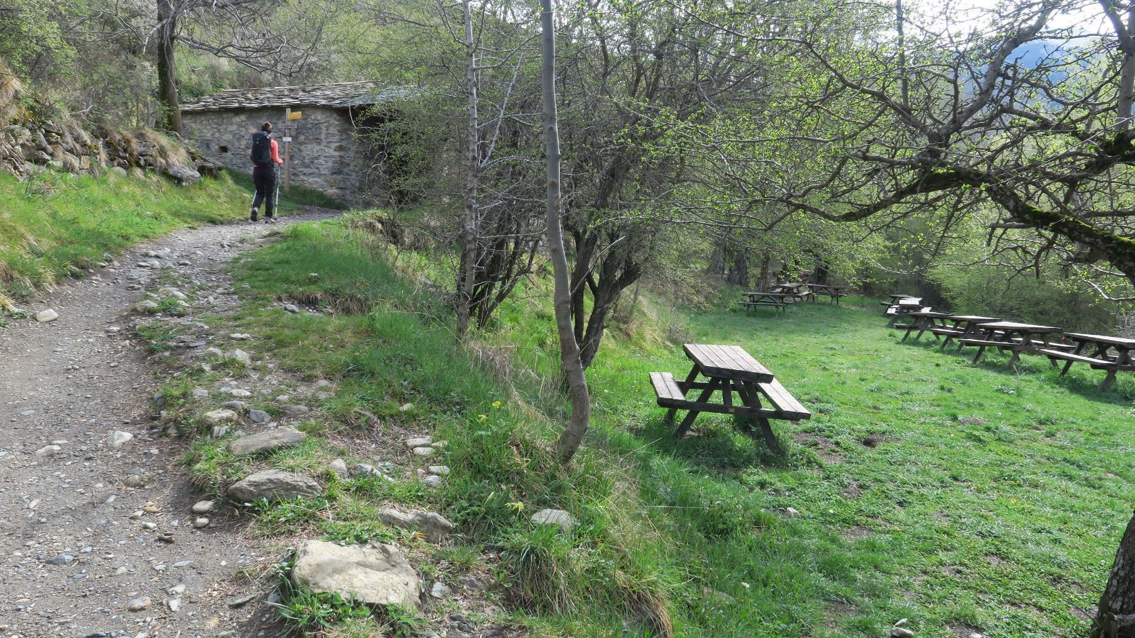 Un pequeño cartel indicativo nos explica la ruta, y tras él comenzamos a ascender suavemente por un camino empedrado y flanqueado por dos muros de piedra seca. Echamos un vistazo hacia el fondo del Valle de Benasque, que hoy ha amanecido con algunas nubes altas, tras la efímera nevada de la noche anterior que blanqueó algunas cumbres.