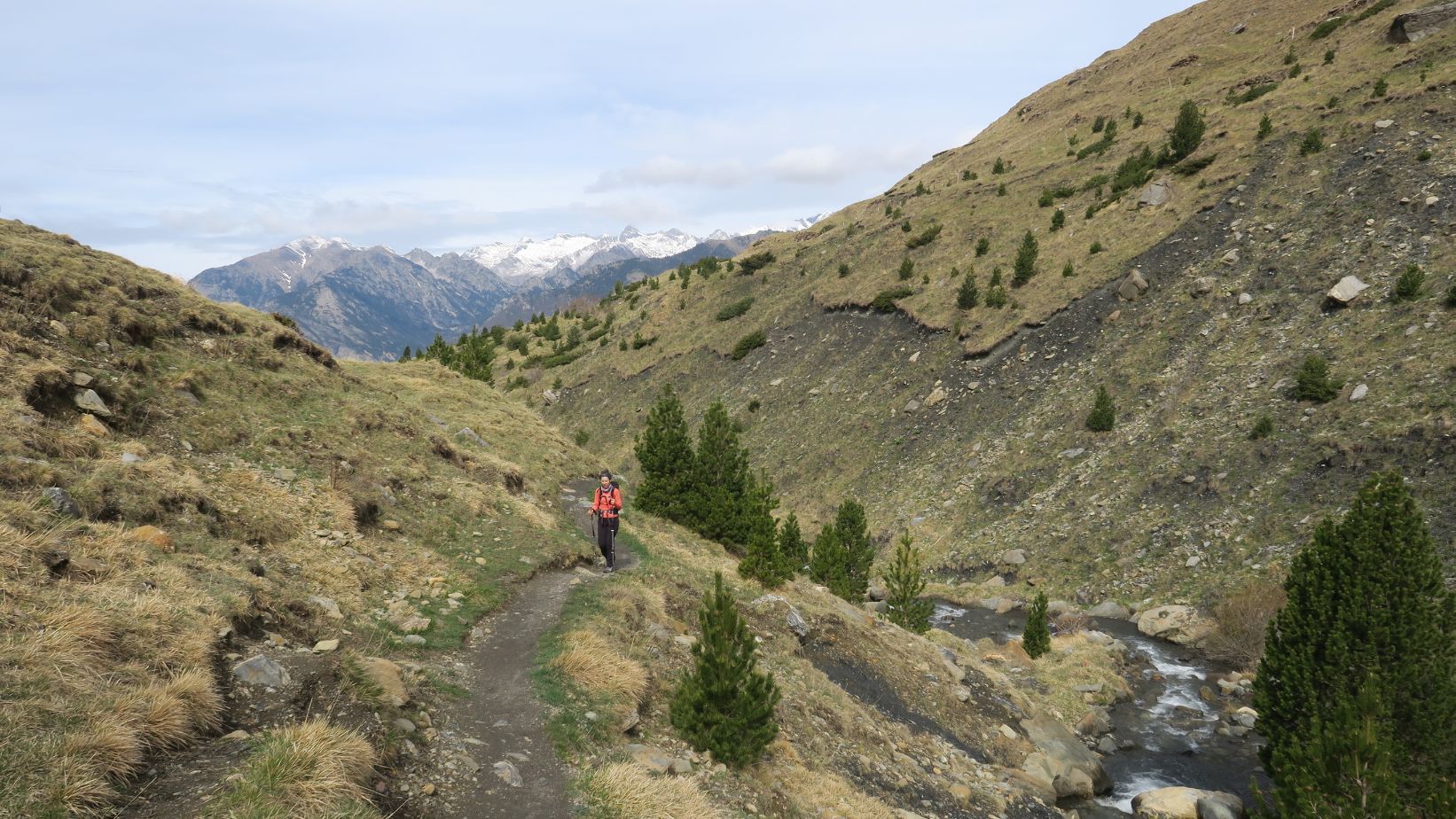 Continuamos la ruta rumbo este, siempre en ascenso, por la margen derecha del Barranco de Remáscaro, que ha dejado marcadas huellas erosivas en su entorno. Echando la vista atrás, asoman algunas cumbres nevadas, tresmiles que se sitúan entre Benasque y Chistau.