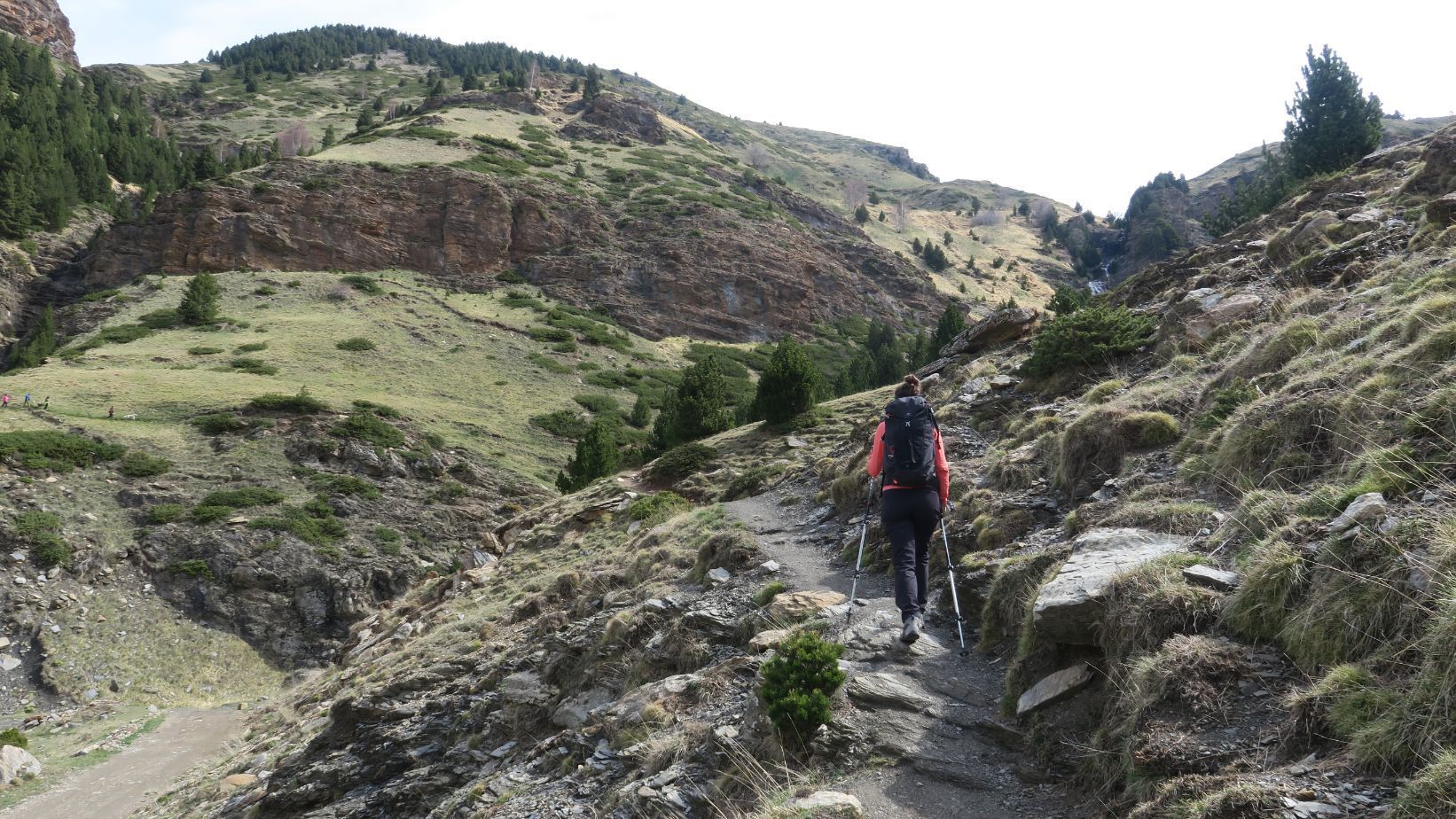 La atravesamos y nos internamos por una senda, señalizada con pinturas verdes, que asciende más potente por un tramo rocoso, duro pero sin dificultad. Poco a poco vamos acercándonos al fondo del valle, adentrándonos en un tramo boscoso que se abre en un par de puntos para permitirnos fotografiar, sin dificultad, alguna de sus cascadas.