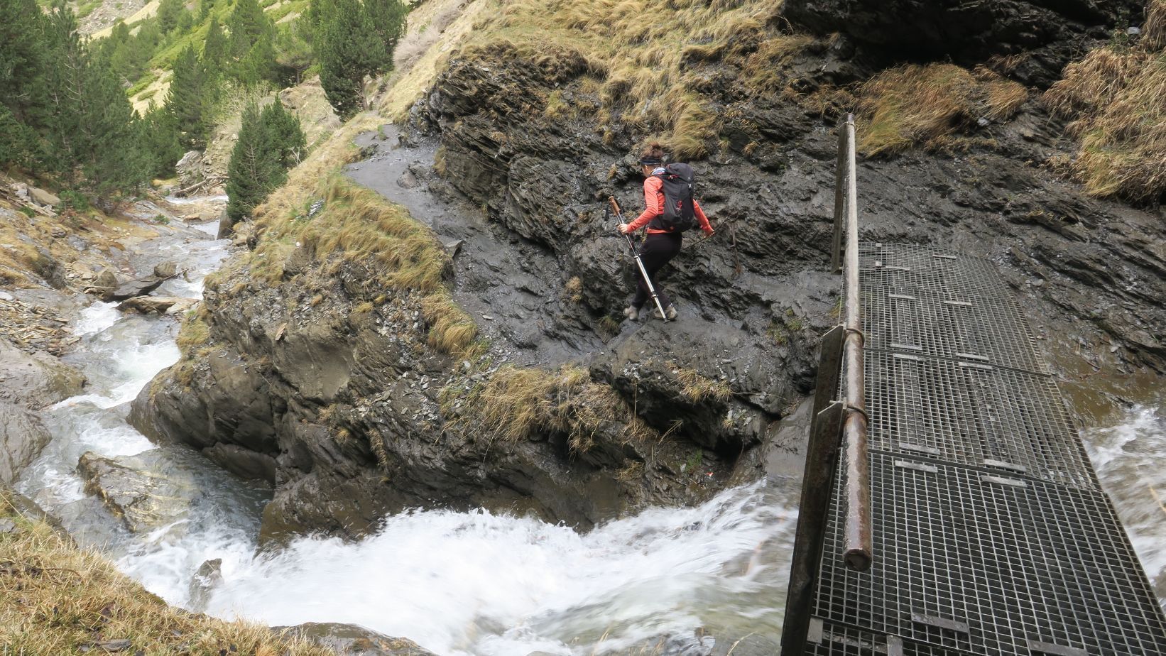 Un pequeño puente metálico, que cruzamos con precaución pues está mojado por el agua de la cascada, nos lleva a la margen derecha del barranco. Nada más cruzar el puente se encuentra el único punto de la ruta que requiere cierta destreza, puesto que hay que atravesar una roca sencilla pero que está siempre mojada y, por ende, resbaladiza. Una cadena metálica nos facilita la labor, y asidos a ella superamos el trámite sin dificultad.