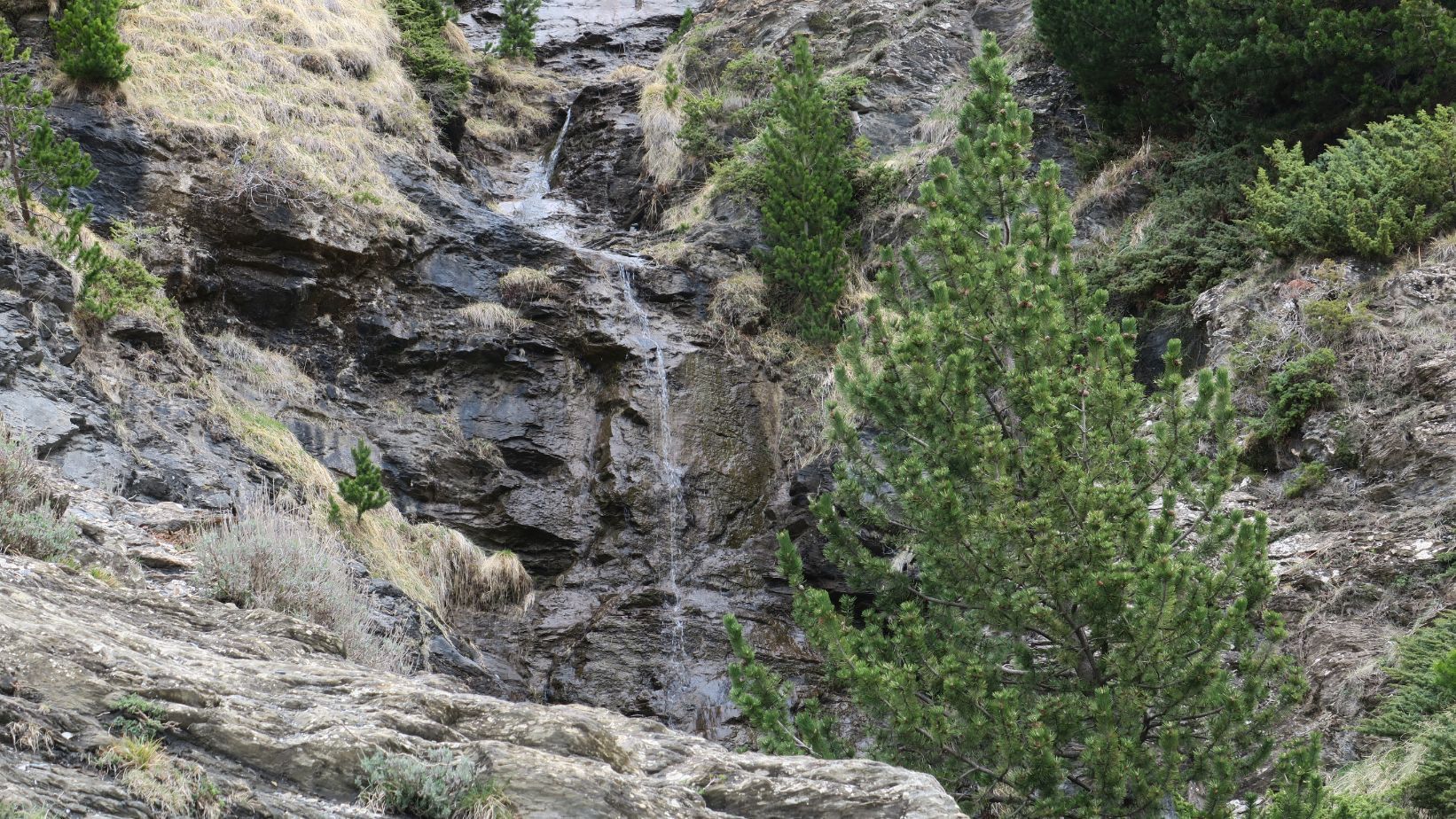 Comenzamos el camino de regreso por la margen derecha del barranco y, en pocos minutos, alcanzamos la Cascada de la Mascarada, a la cual accedemos tras cruzar un pequeño puente metálico. Apenas unos hilillos de agua descienden por la roca; quizá en épocas de deshielo más potente muestre su mejor cara.