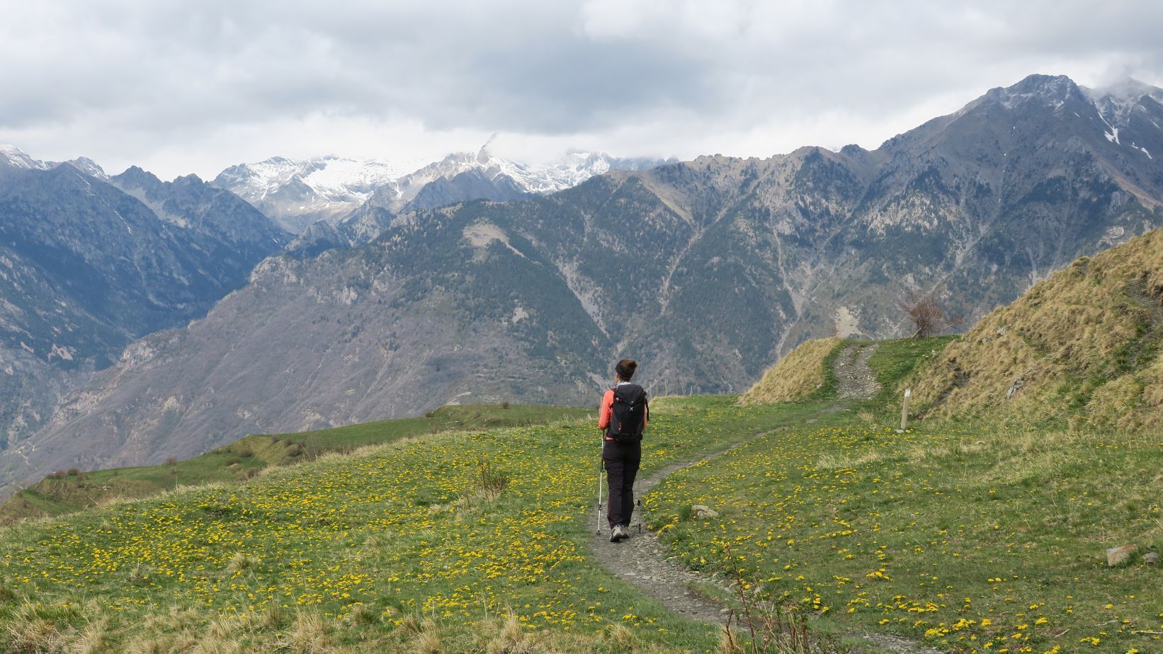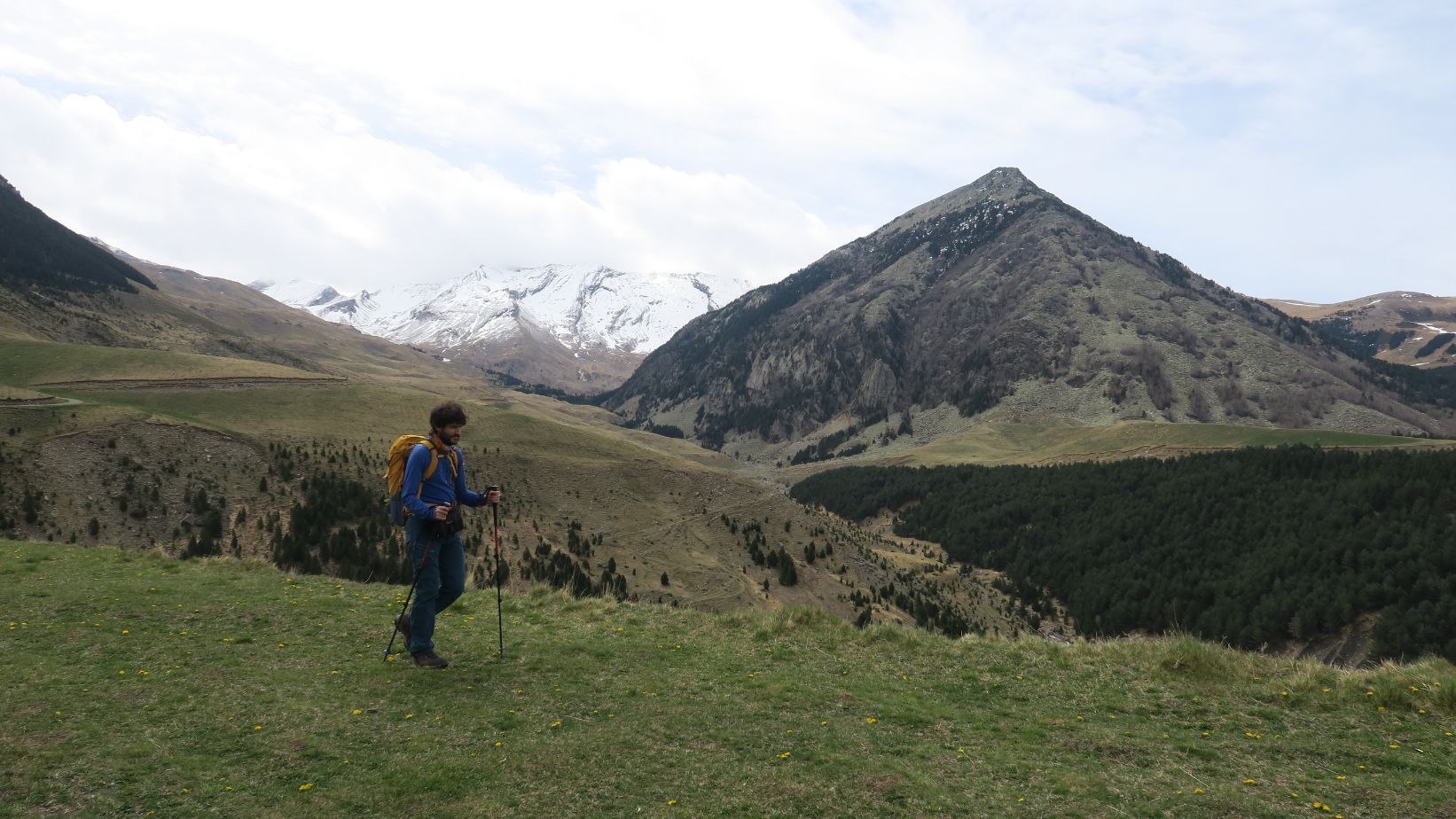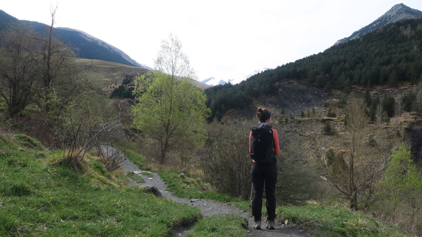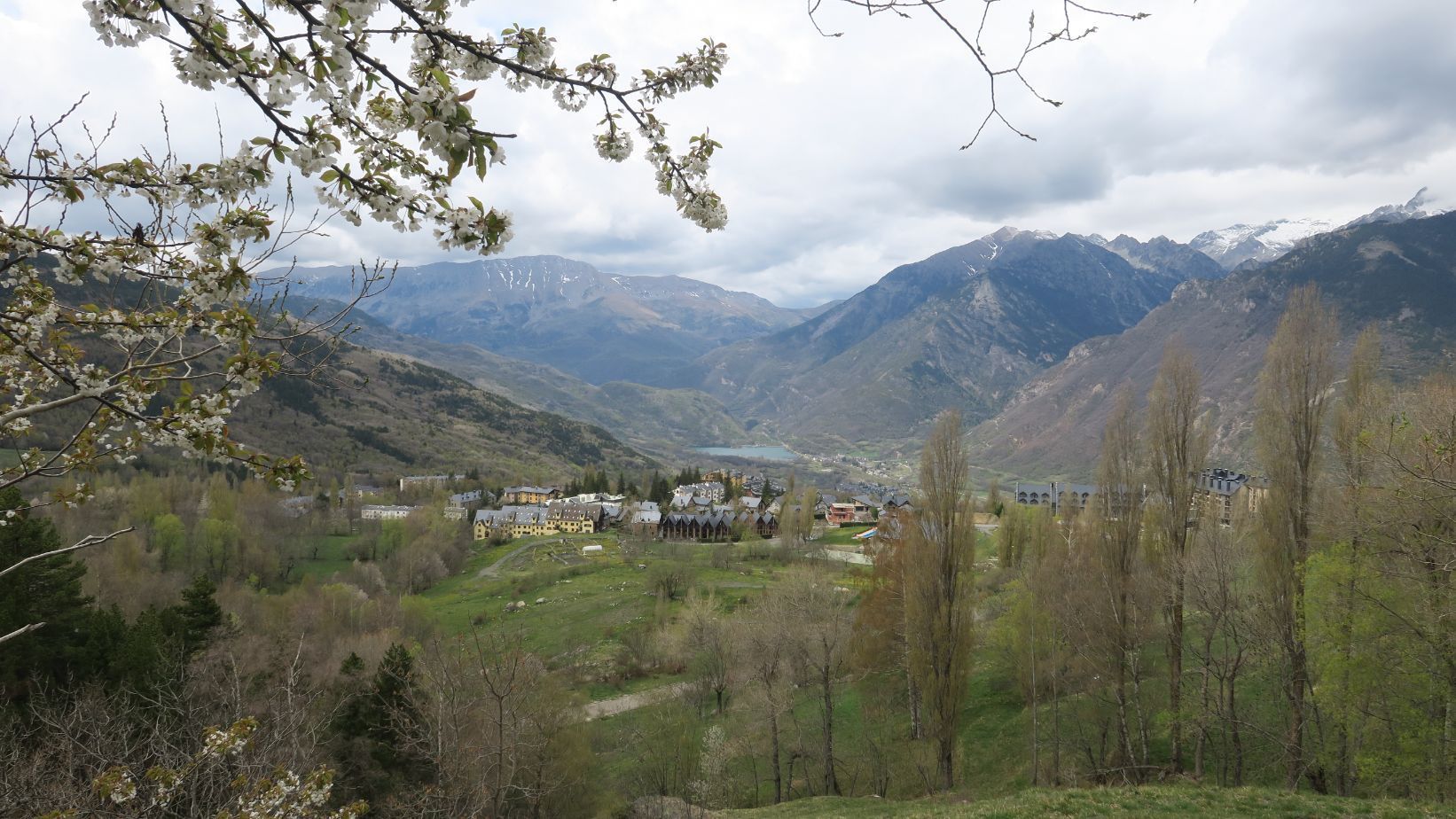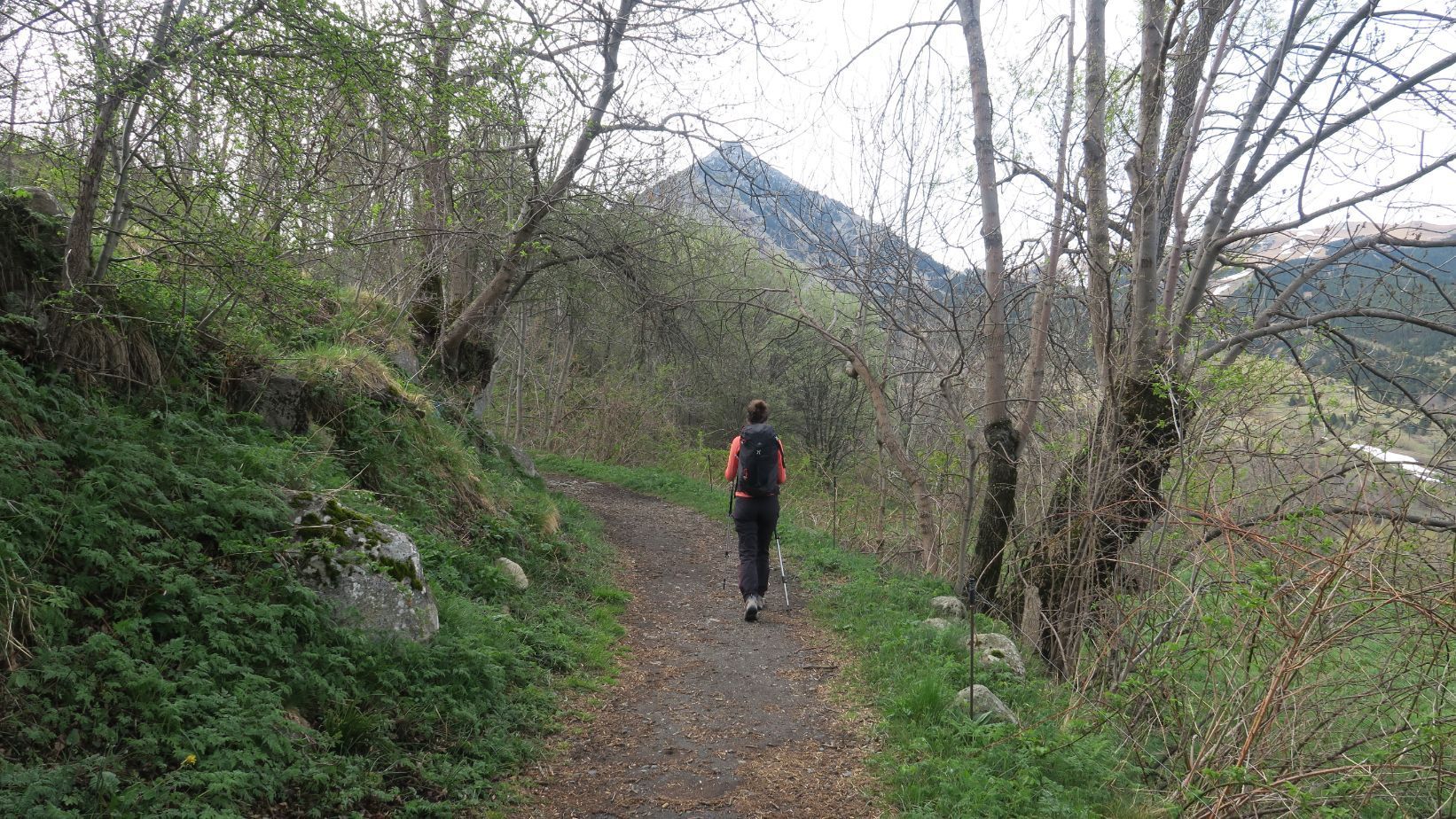 La senda de regreso, también cómoda, resulta más panorámica que la de ida puesto que realiza un recorrido a media ladera, a una cota más elevada. Así, jugando con el zoom, podemos obtener unas espectaculares panorámicas de las nevadas cumbres del valle.