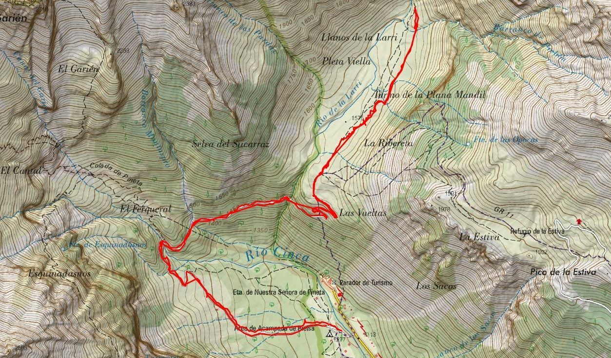 Ruta realizada: Pradera de Pineta – Pista forestal – Puente sobre el Río Cinca – Llanos de la Larri – Cascada al fondo de los llanos – Llanos de la Larri – Regreso por la pista forestal – Pradera de Pineta.