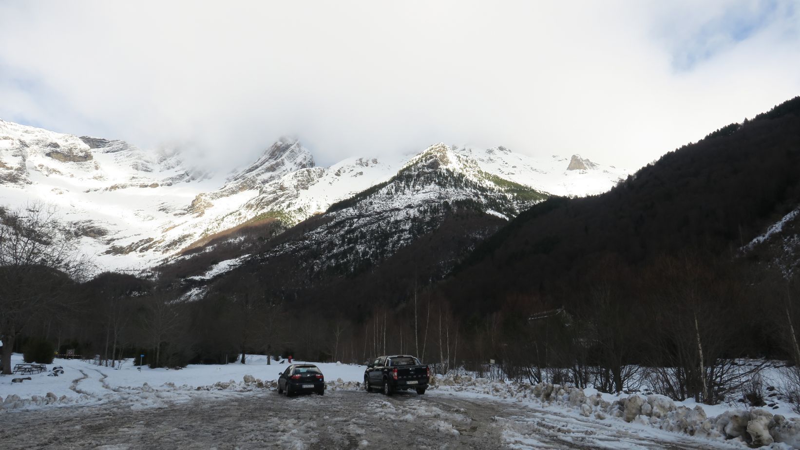 Así, dejamos el coche en la Pradera de Pineta, ya rodeados de un paisaje perfectamente innivado, aunque el día ha amanecido con unos más que agradables 2ºC cuando llegamos al aparcamiento.