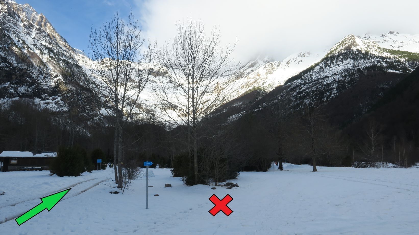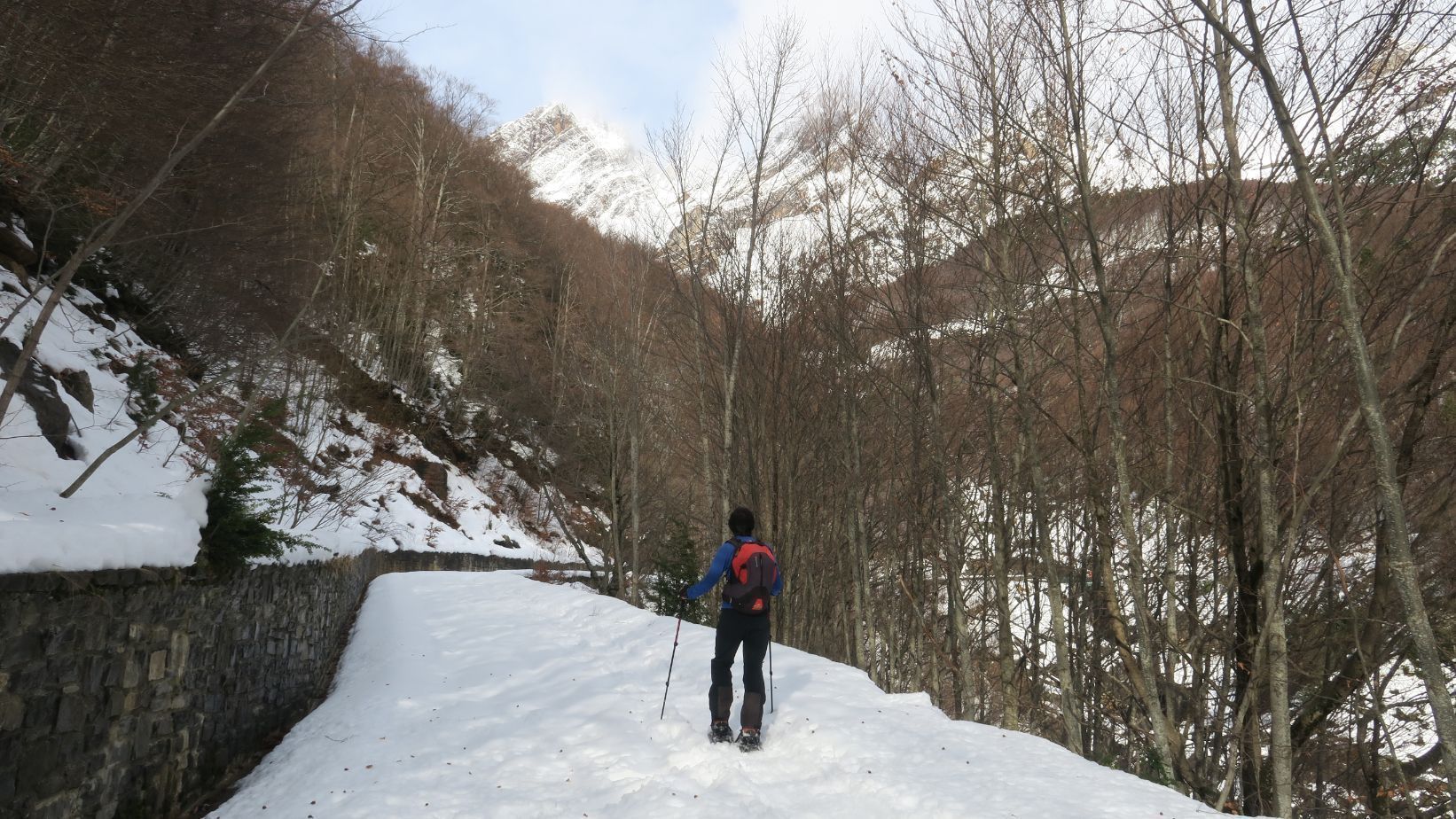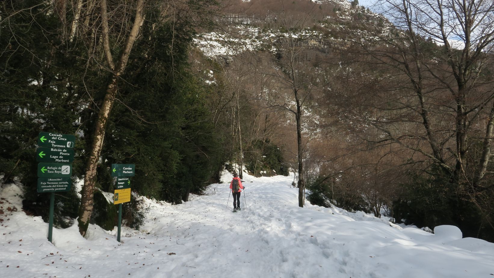 Nos ponemos las raquetas ya en la propia pradera y comenzamos a caminar por la pista forestal, en dirección al fondo del valle. Si bien en unos pocos metros encontramos un cartel azul (“Lalarri”) que nos lleva a la derecha, hacemos caso omiso a dichas indicaciones (nos llevarían hacia la zona del parador, para continuar luego por sendero) y seguimos por la pista, hasta toparnos con el cartel de entrada al Parque Nacional de Ordesa y Monte Perdido. Entramos en terreno protegido, por lo que debemos ser (si cabe más) respetuosos con nuestro entorno.