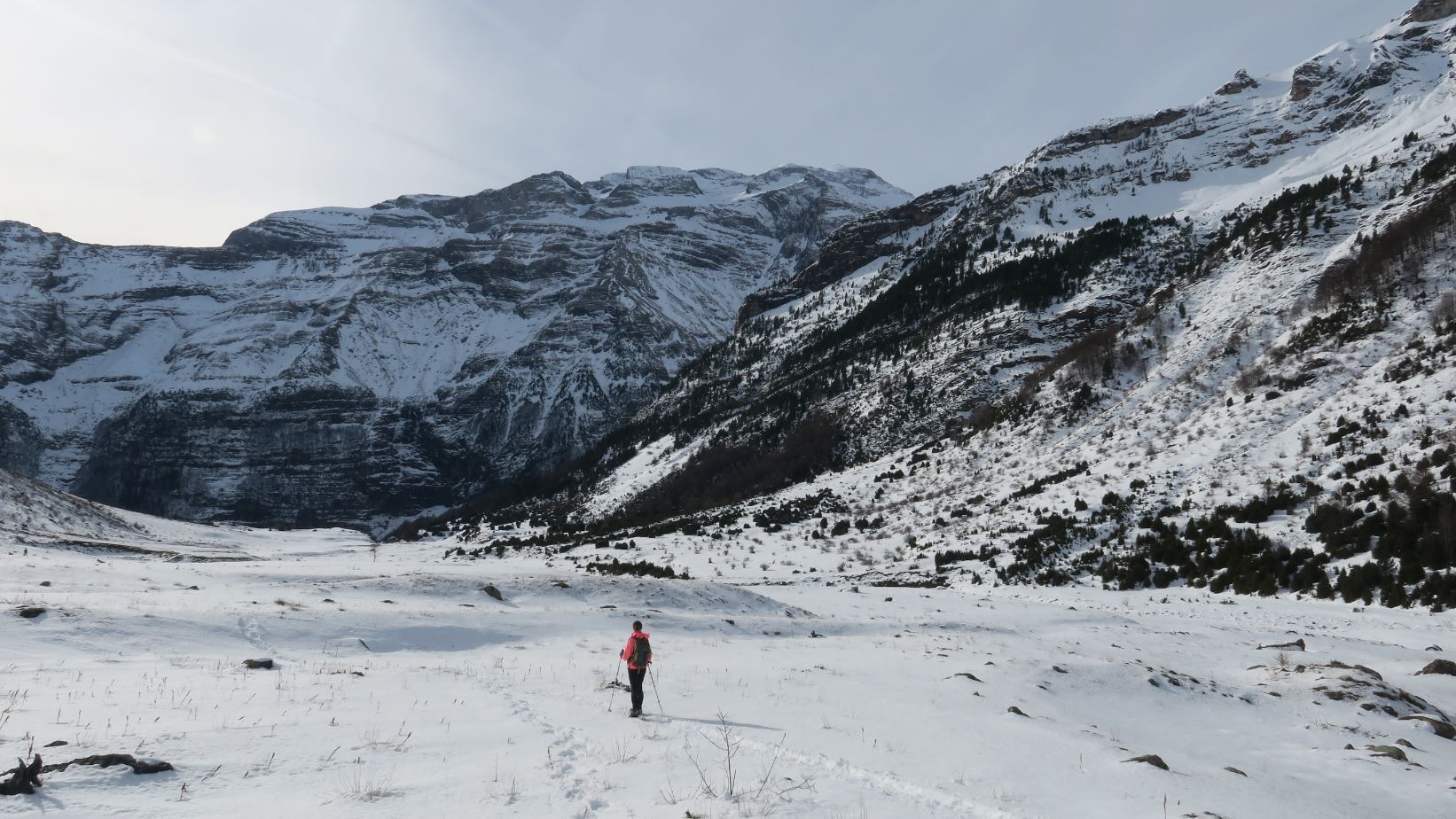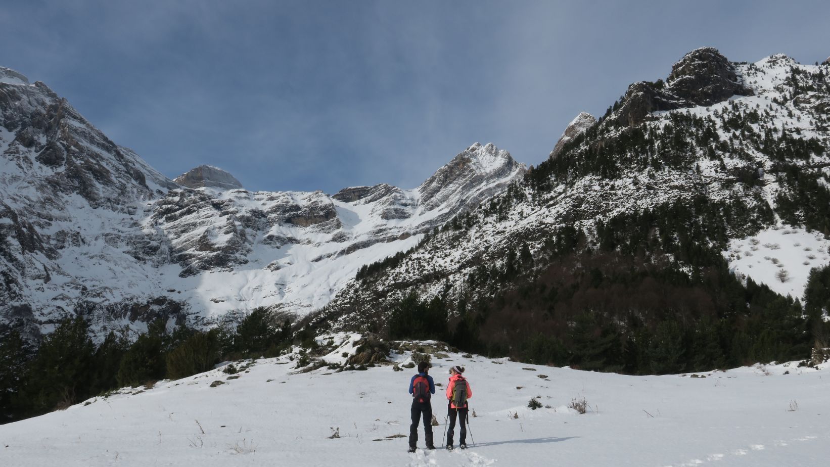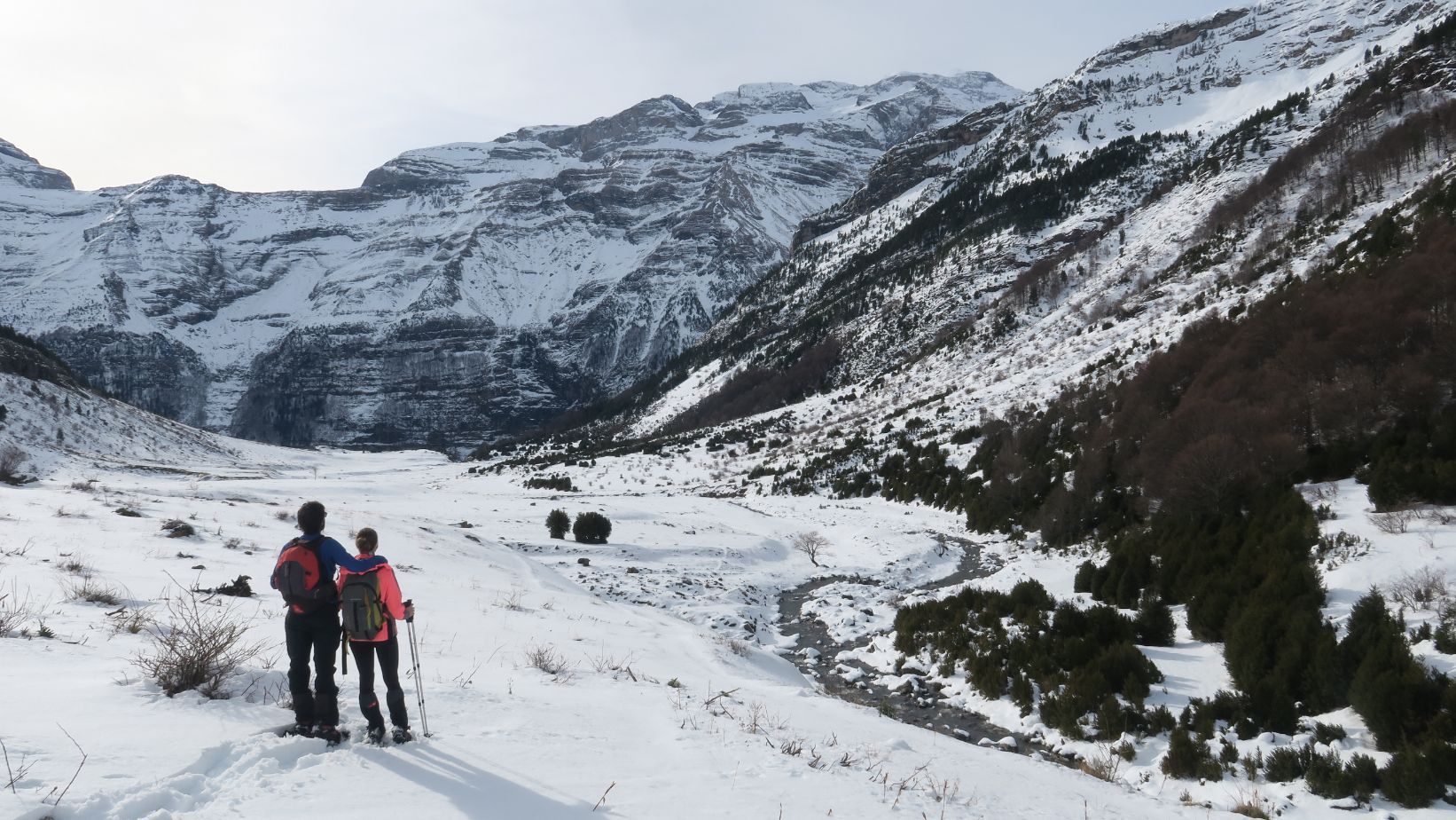 Por mucho que regresemos al Valle de Pineta, lo cual hacemos al menos un par de veces al año, siempre nos sorprende con sus magníficas dimensiones y verticales paredes, desprendiendo un aureza de grandeza y perfección. Este año, aprovechando un domingo de buen tiempo tras unos días de nieve en cotas bajas, decidimos realizar una ruta que ya conocemos, pero con la peculiaridad de que esta vez la haremos con raquetas de nieve, para empaparnos de la esencia más invernal del valle.