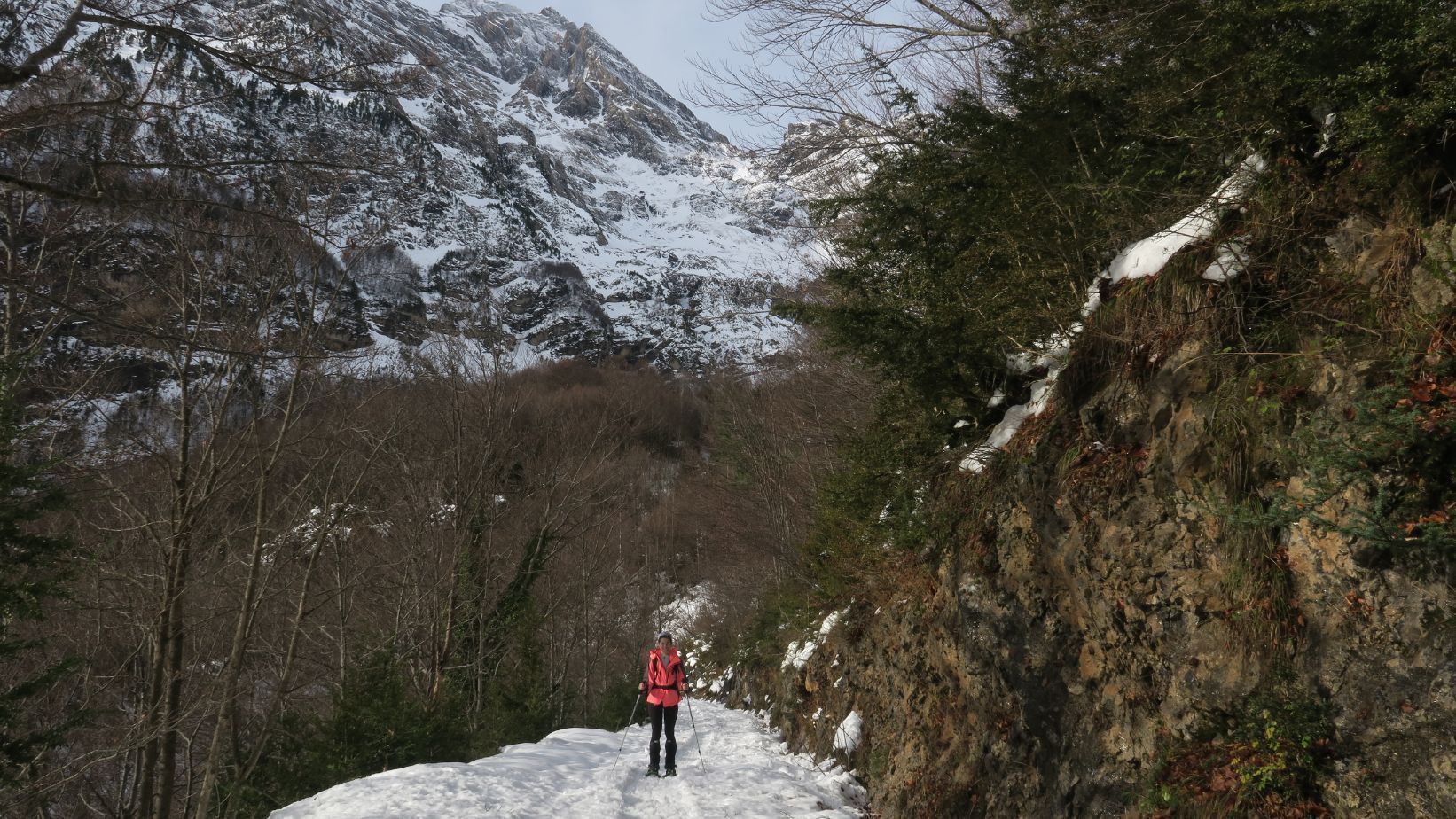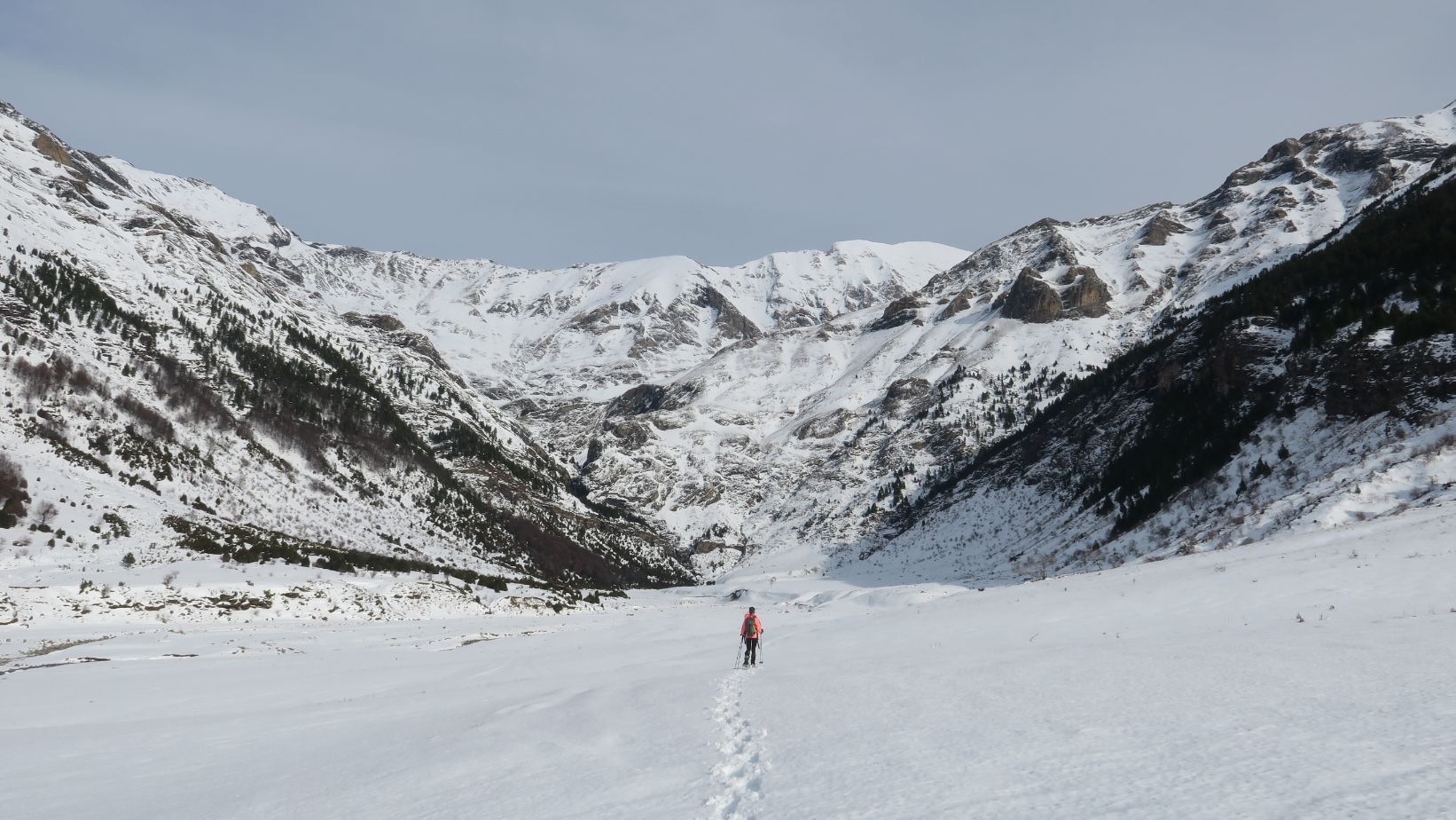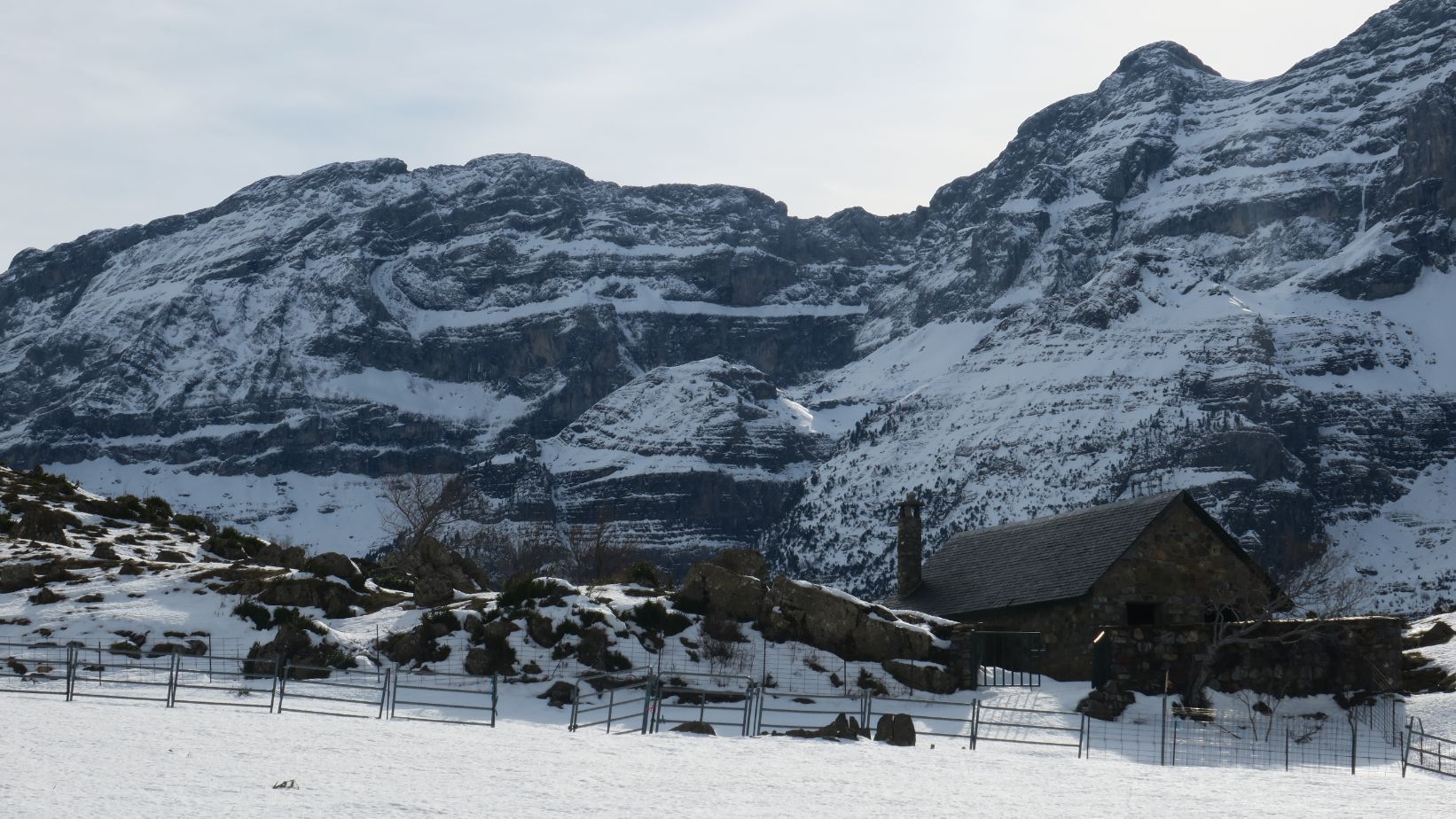 Por mucho que regresemos al Valle de Pineta, lo cual hacemos al menos un par de veces al año, siempre nos sorprende con sus magníficas dimensiones y verticales paredes, desprendiendo un aureza de grandeza y perfección. Este año, aprovechando un domingo de buen tiempo tras unos días de nieve en cotas bajas, decidimos realizar una ruta que ya conocemos, pero con la peculiaridad de que esta vez la haremos con raquetas de nieve, para empaparnos de la esencia más invernal del valle.