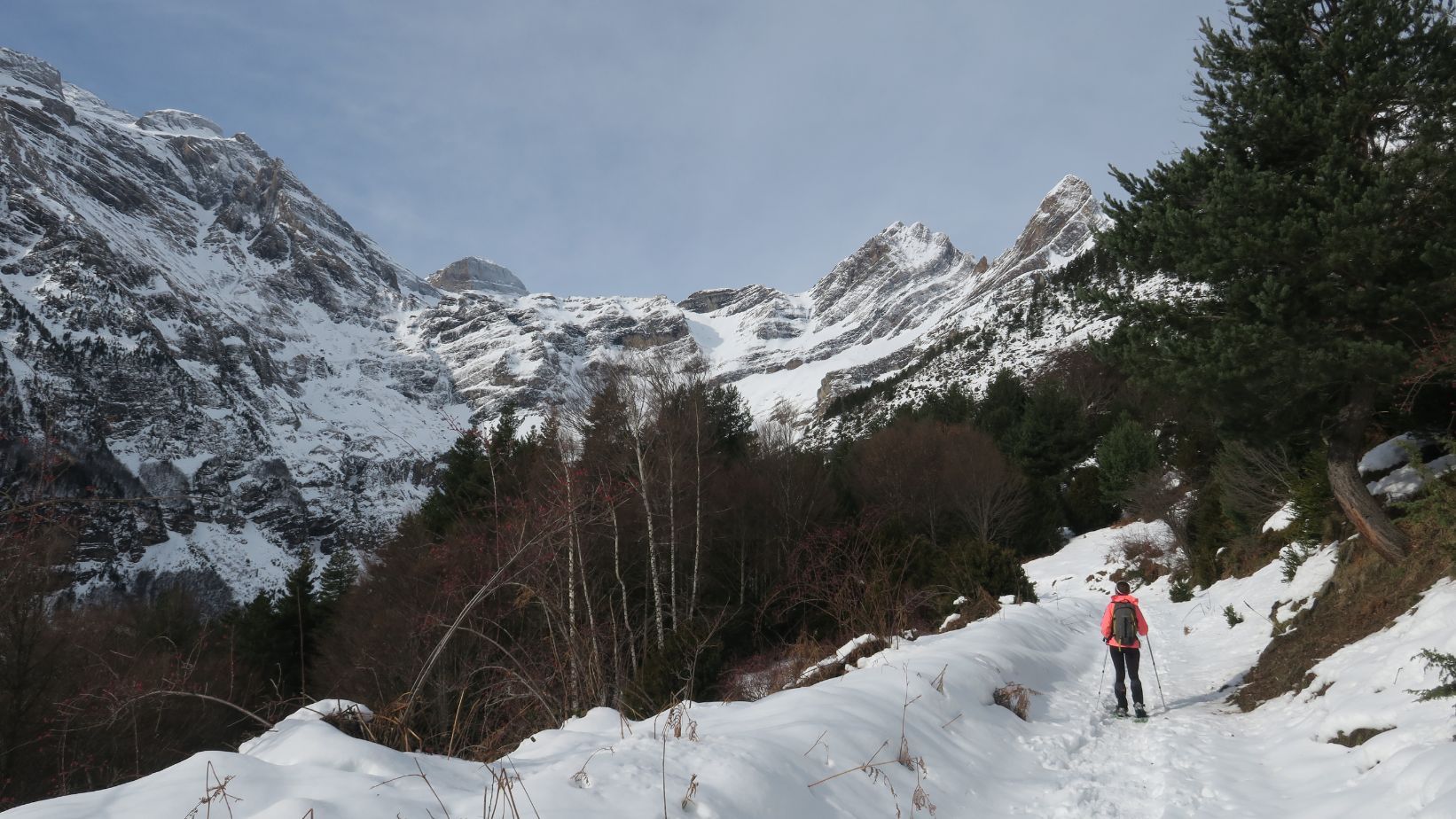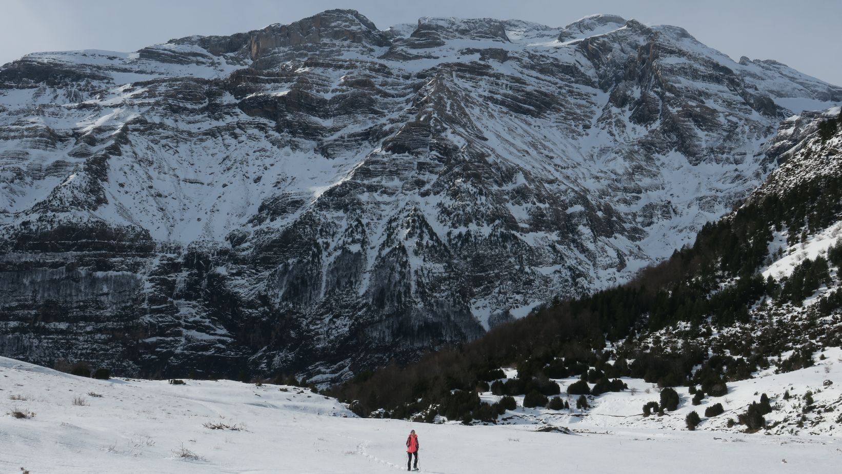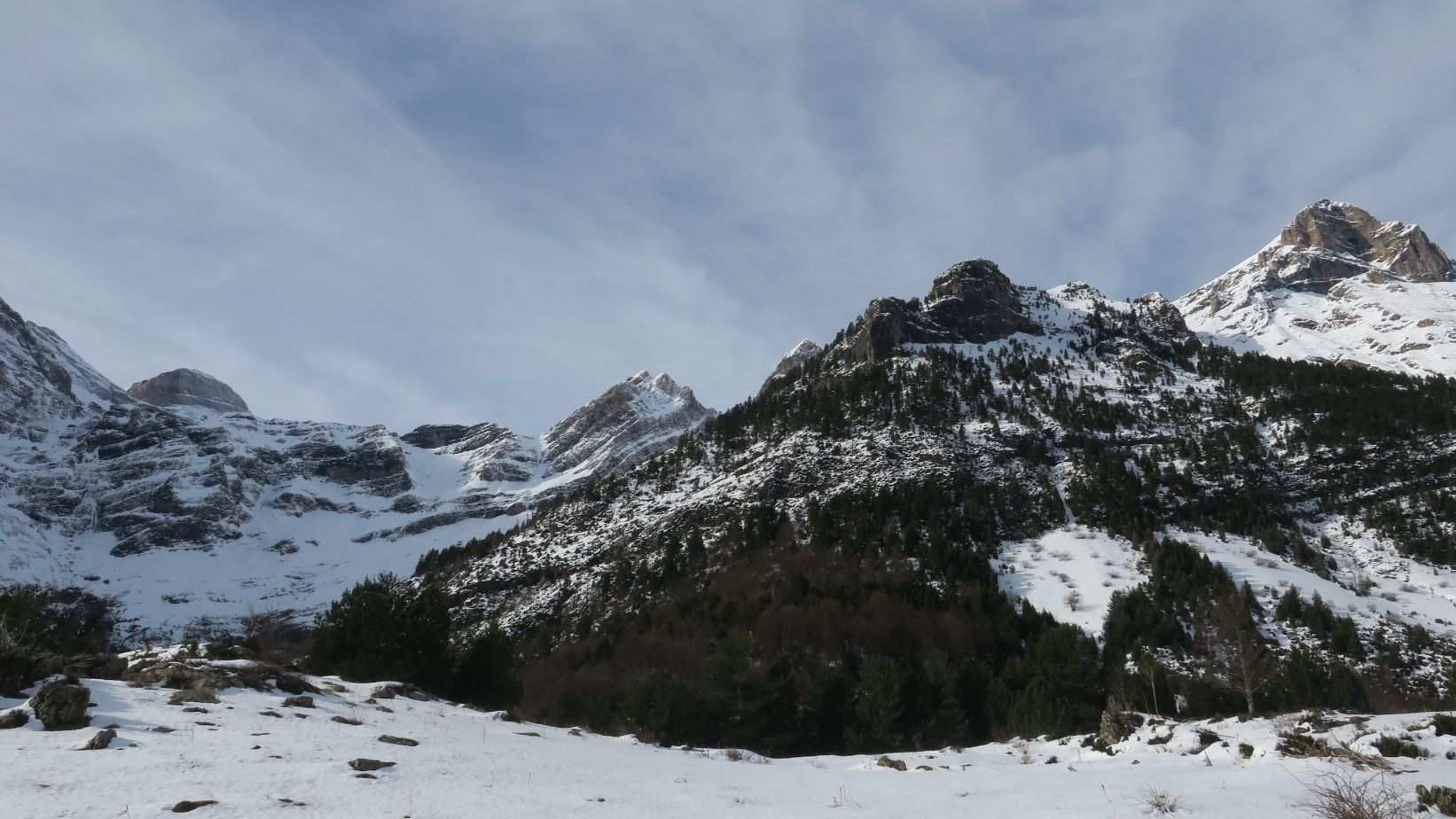 A nuestro alrededor las cumbres del Valle de Pineta comienzan a recibir los primeros rayos de sol de este día invernal, con cielos algo velados pero espectaculares. Frente a nosotros se encuentra, casi 1500 metros por encima, el Balcón de Pineta, uno de los más espectaculares miradores del Pirineo aragonés.