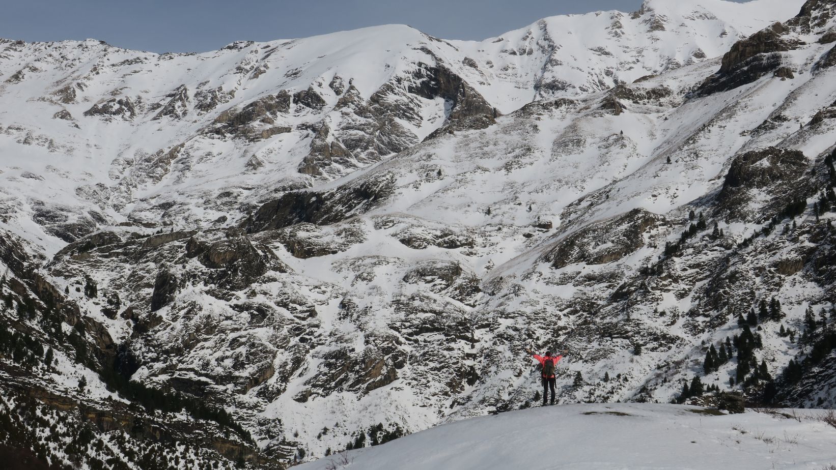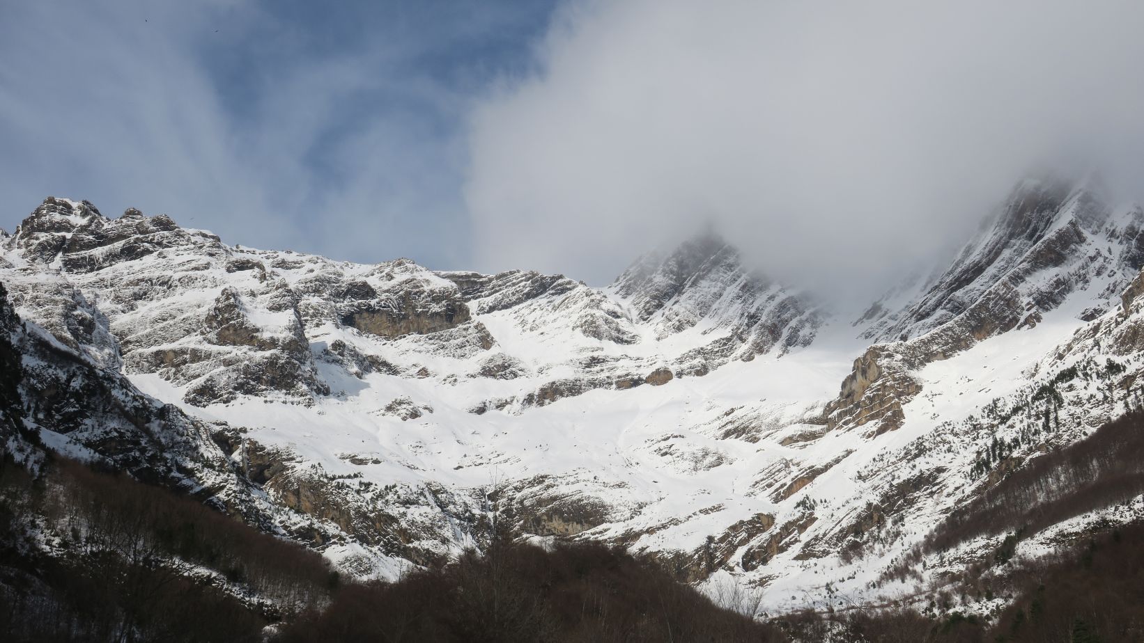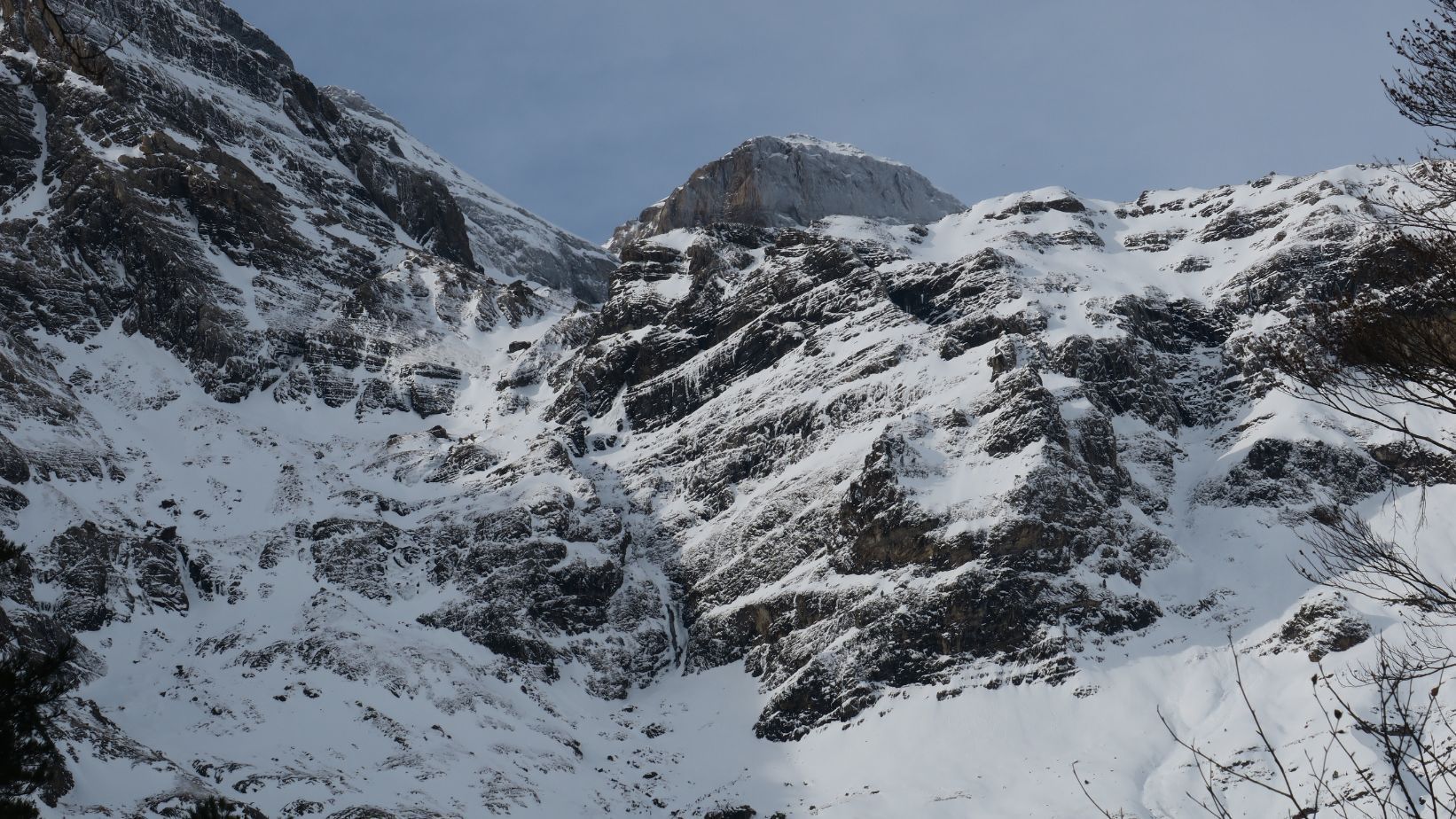 A nuestro alrededor las cumbres del Valle de Pineta comienzan a recibir los primeros rayos de sol de este día invernal, con cielos algo velados pero espectaculares. Frente a nosotros se encuentra, casi 1500 metros por encima, el Balcón de Pineta, uno de los más espectaculares miradores del Pirineo aragonés.