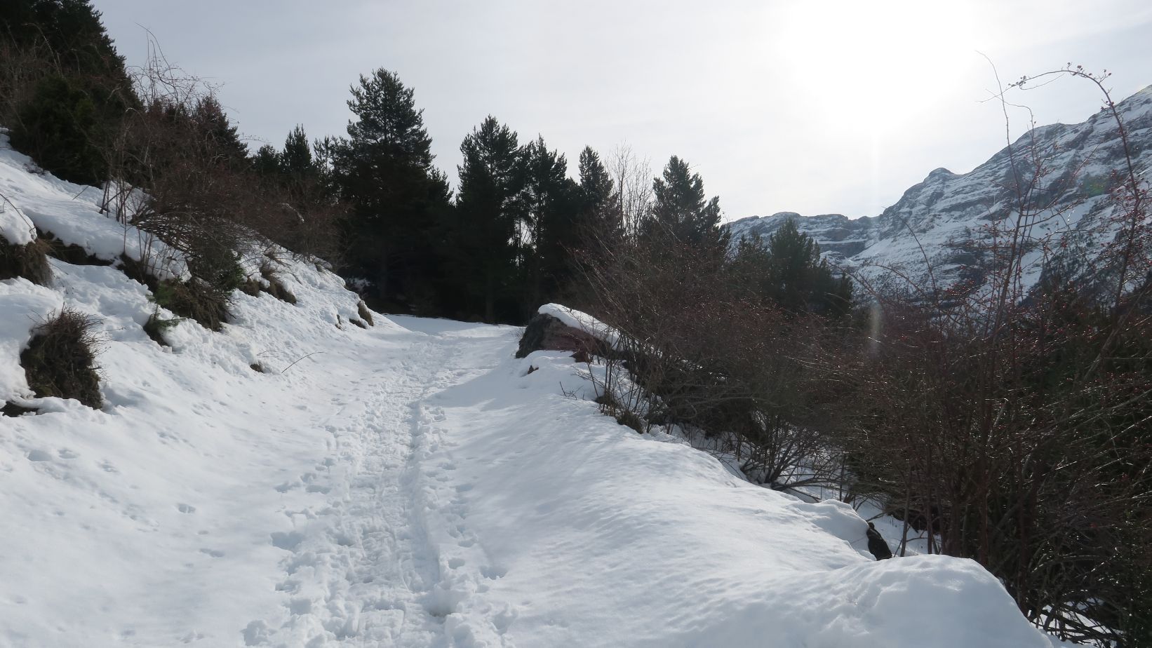 La pista continua en continuo pero suave ascenso, otorgándonos ya una notable panorámica de las paredes que cierran el valle por el sur, verticales, heladas y cautivadoras.