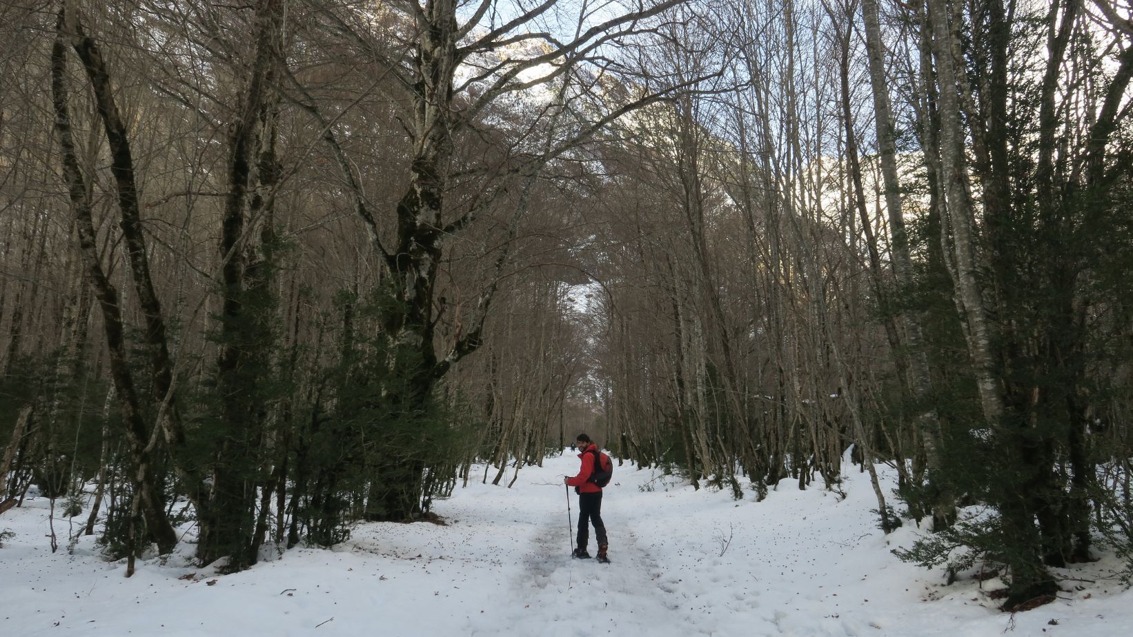El primer tramo, una larga recta, llanea por un tramo de bosque espectacular, con una estampa invernal de cuento. Seguimos las trazas claras en la nieve, aunque la pista no tiene pérdida en ningún momento.