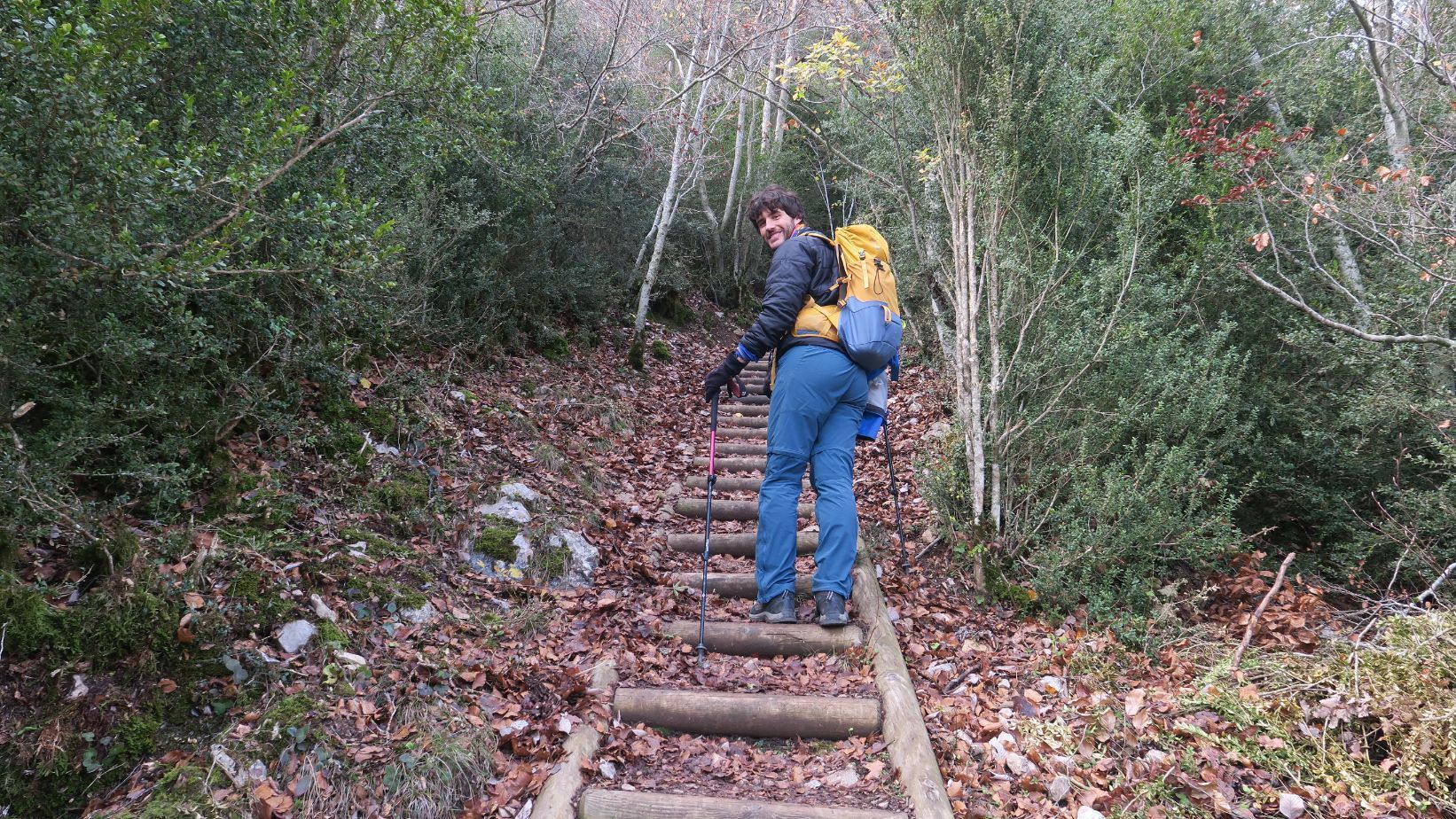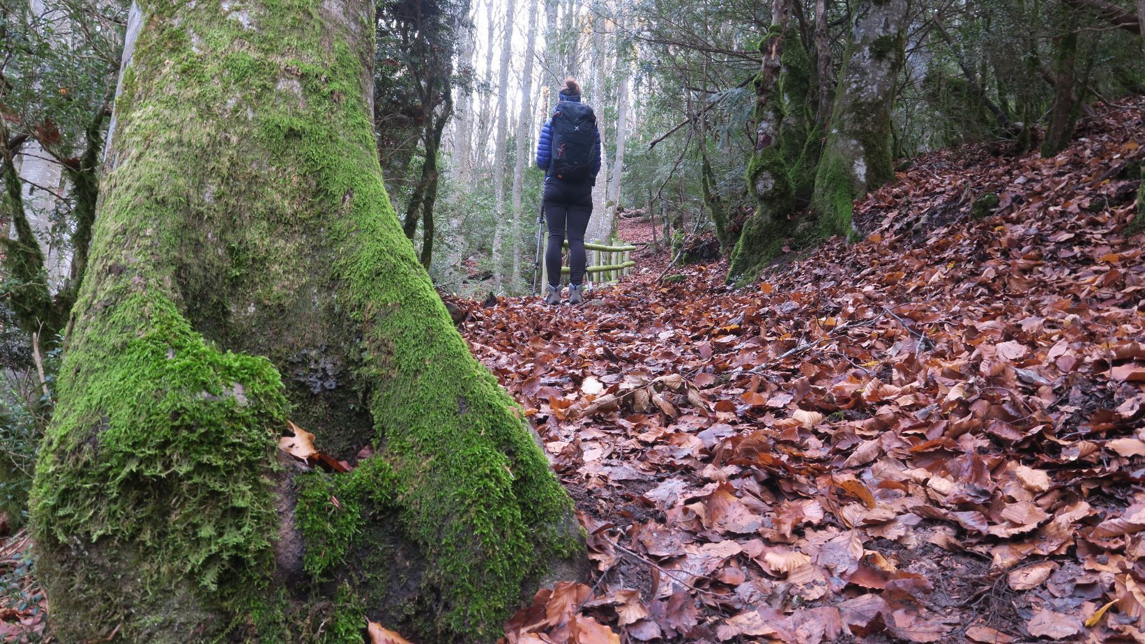 En un primer momento la senda serpentea, ascendiendo con calma, por un tramo de bosque. Pero pronto comienza a empinarse y a subir, de manera directa, por el bosque. El suelo, resbaladizo por la humedad matutina y las recientes lluvias, nos obliga a prestar precaución, evitando las zonas más embarradas. Algunos escalones construidos con troncos de madera nos permiten avanzar con mayor comodidad.
