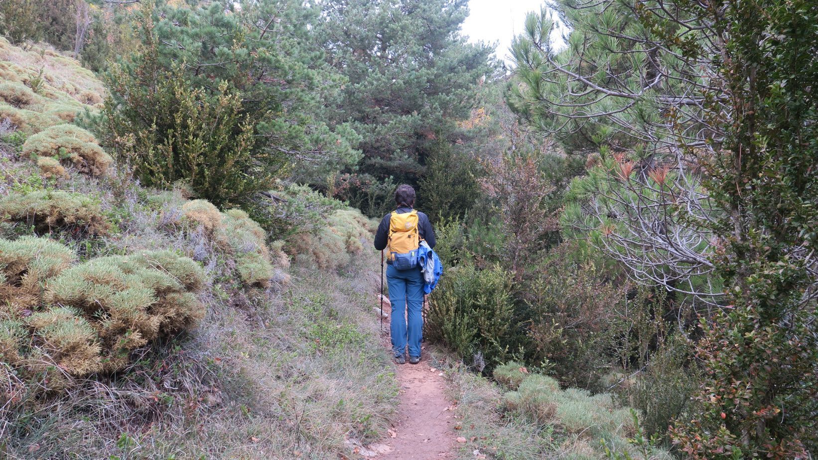 La senda, inicialmente, asciende de manera muy suave. Se trata de un camino muy estrecho, en el que vamos sorteando grandes arbustos de boj y los siempre llamativos erizones (recomendable llevar pantalón largo para evitar los pinchos de estos últimos).
