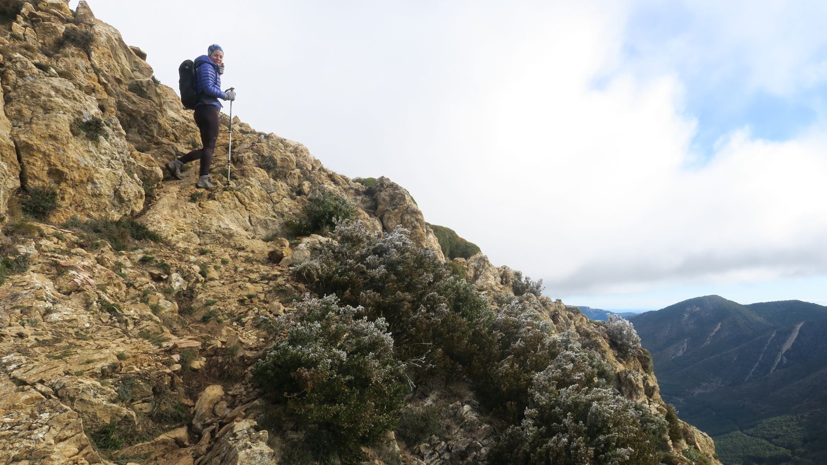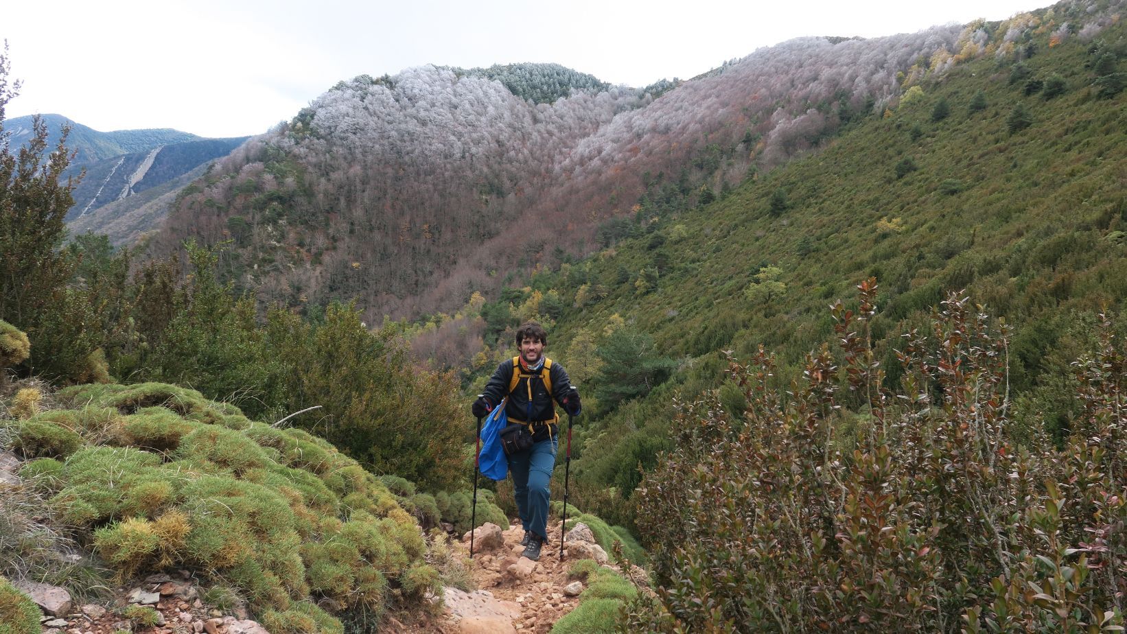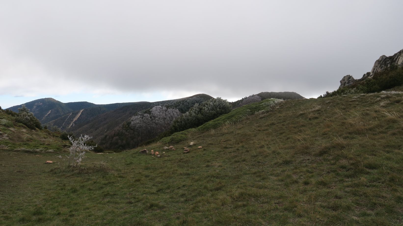 Desde este punto el camino vira hacia el noreste, para volver a ganar pendiente mientras sorteamos la maraña de boj y erizones decorados con cencellada. La noche habrá sido heladora, y a pesar de ser mediodía la temperatura dudamos que supere mucho los cero grados. Con el viento reinante, la sensación térmica no invita a detenerse mucho.