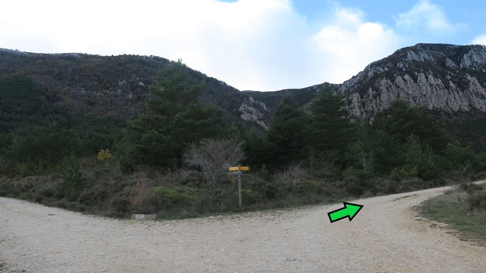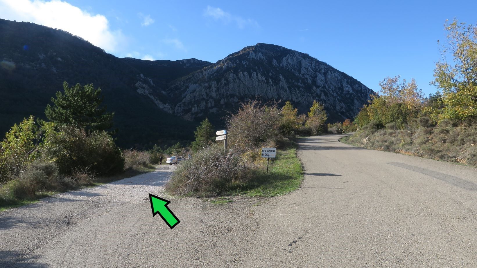 Este cruce de caminos es el ideal dejar el vehículo. La ruta comienza saliendo hacia la derecha.