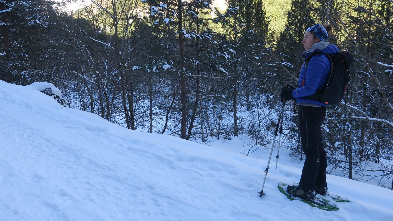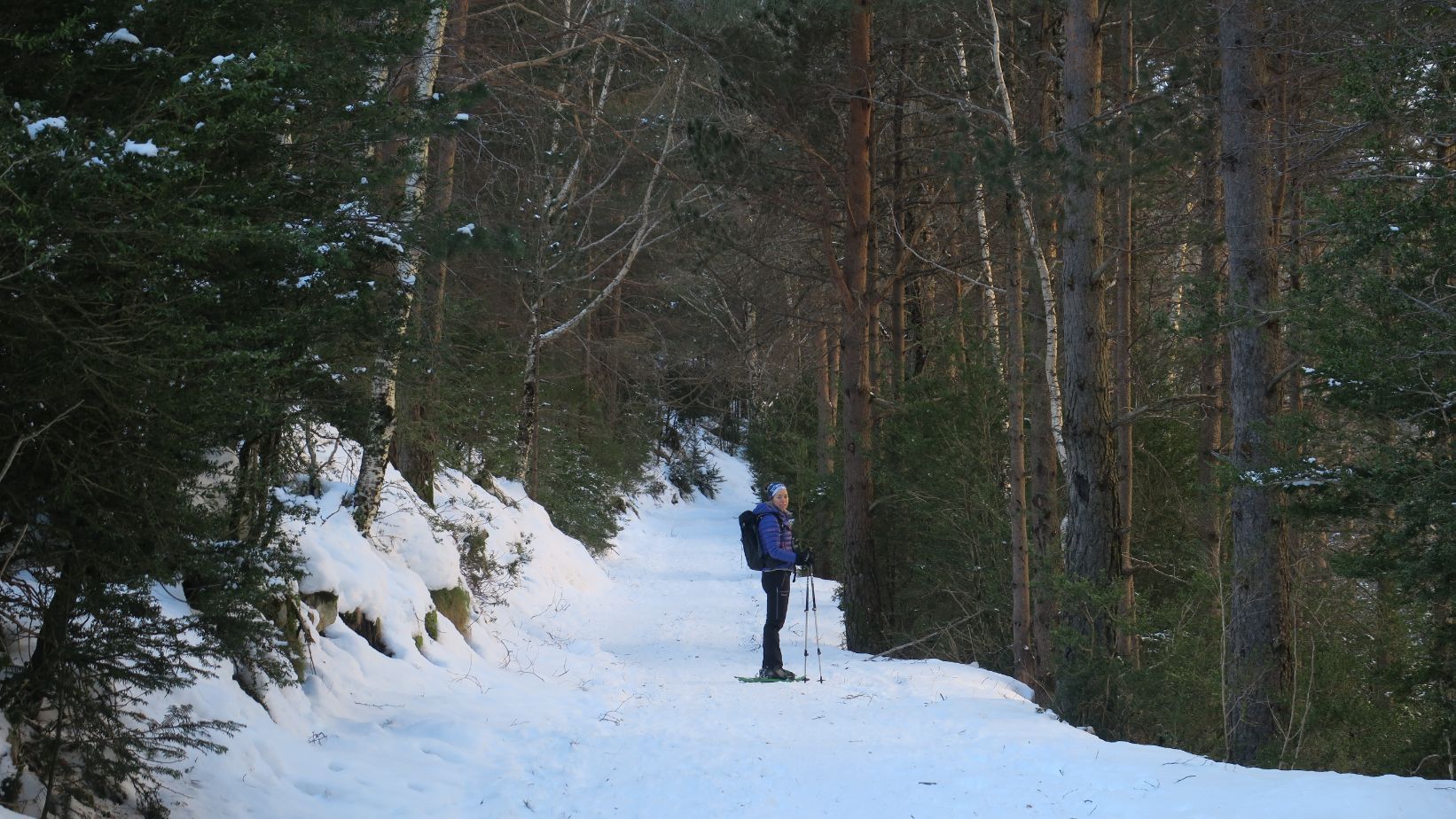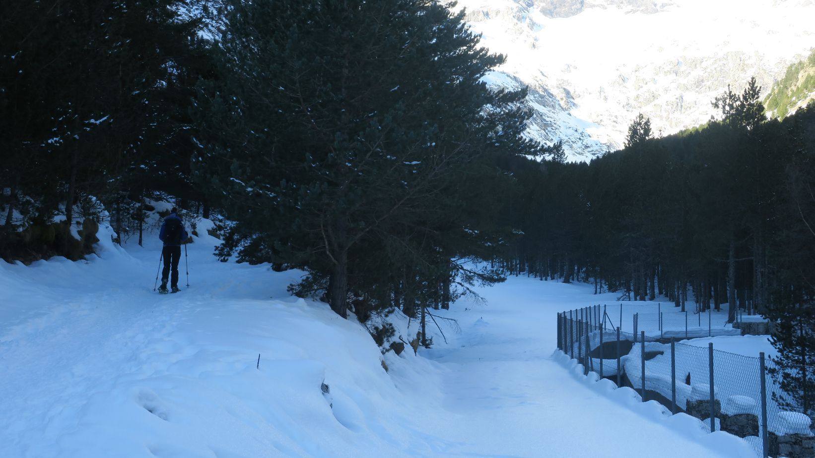 La pista, que transcurre por medio de un bosque de pinos, realiza una amplia curva hacia la izquierda, para pasar de rumbo norte a oeste, adentrándose poco a poco en el valle. El día ha amanecido soleado y sin viento; sin embargo, el camino transita zonas de sombra donde el frío, todavía a estas horas, es potente.
