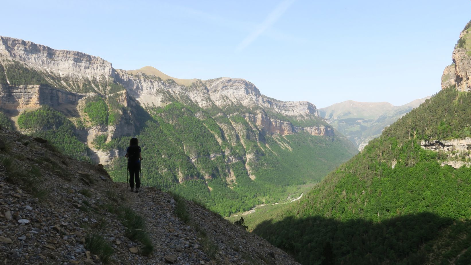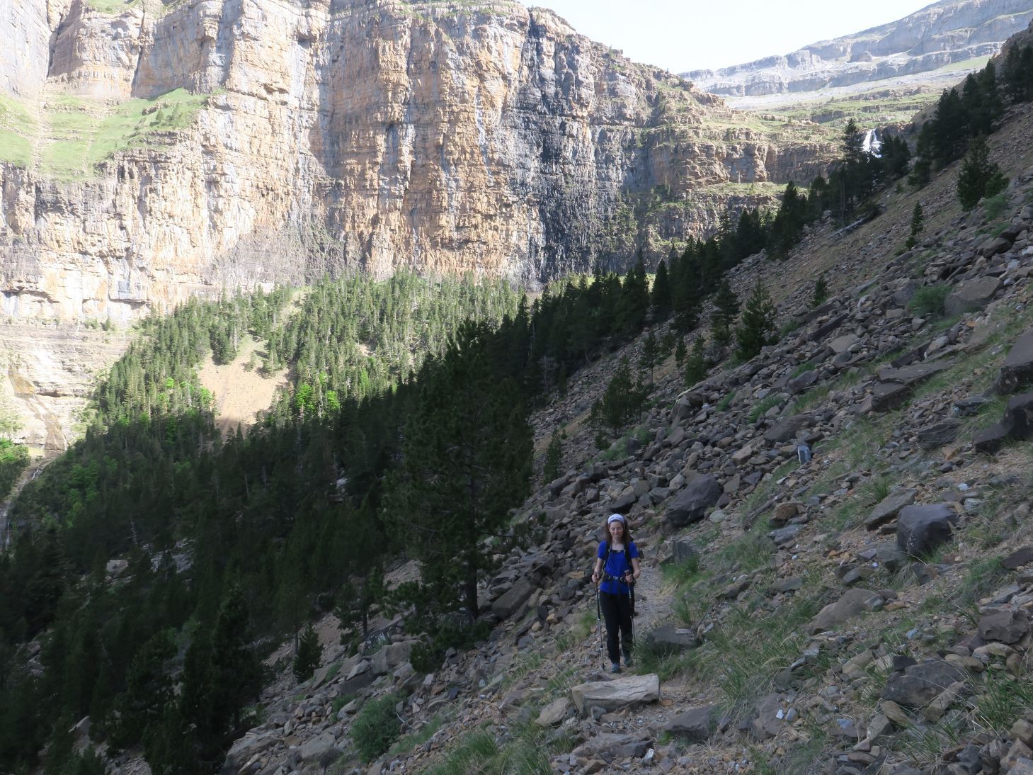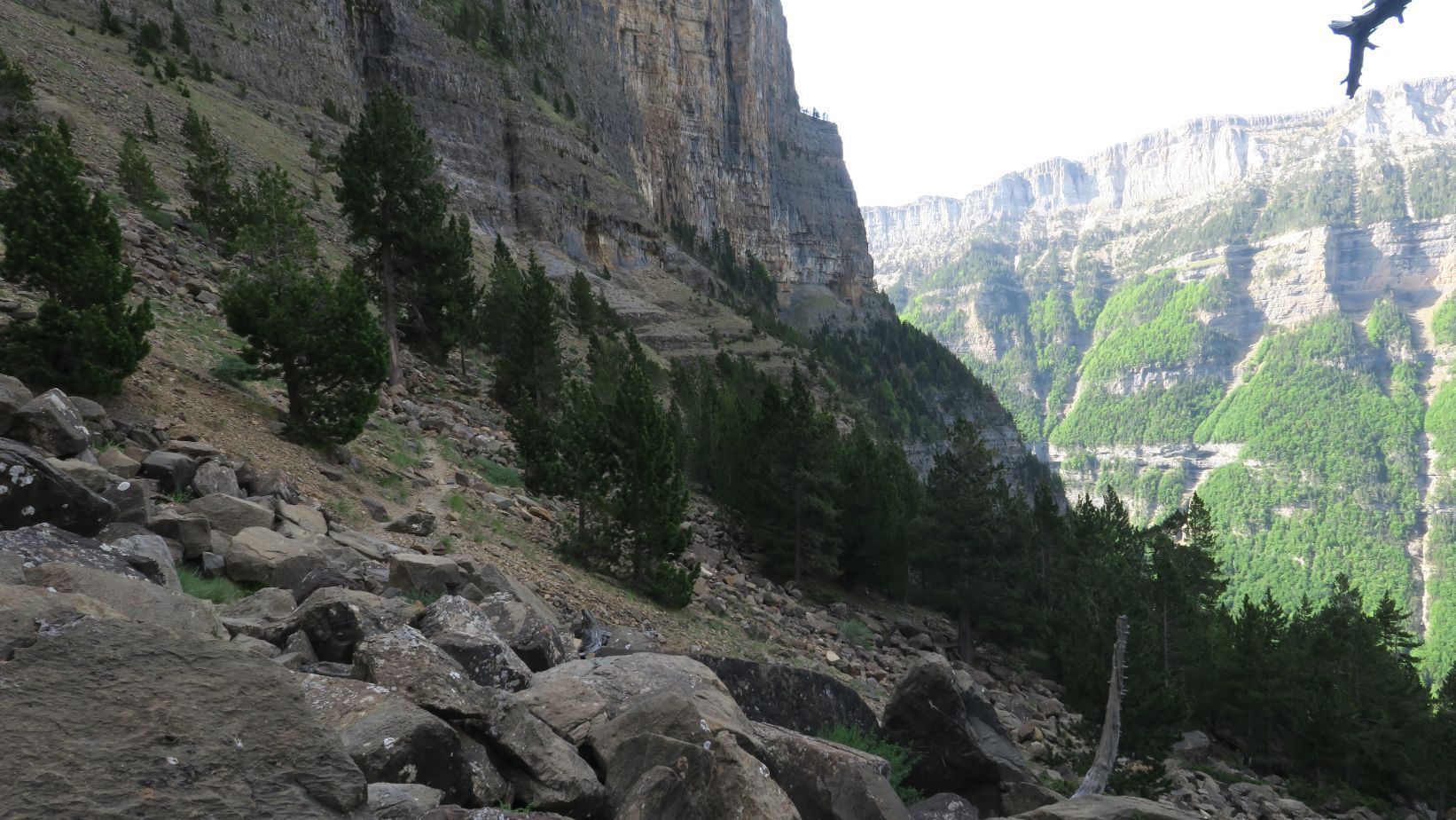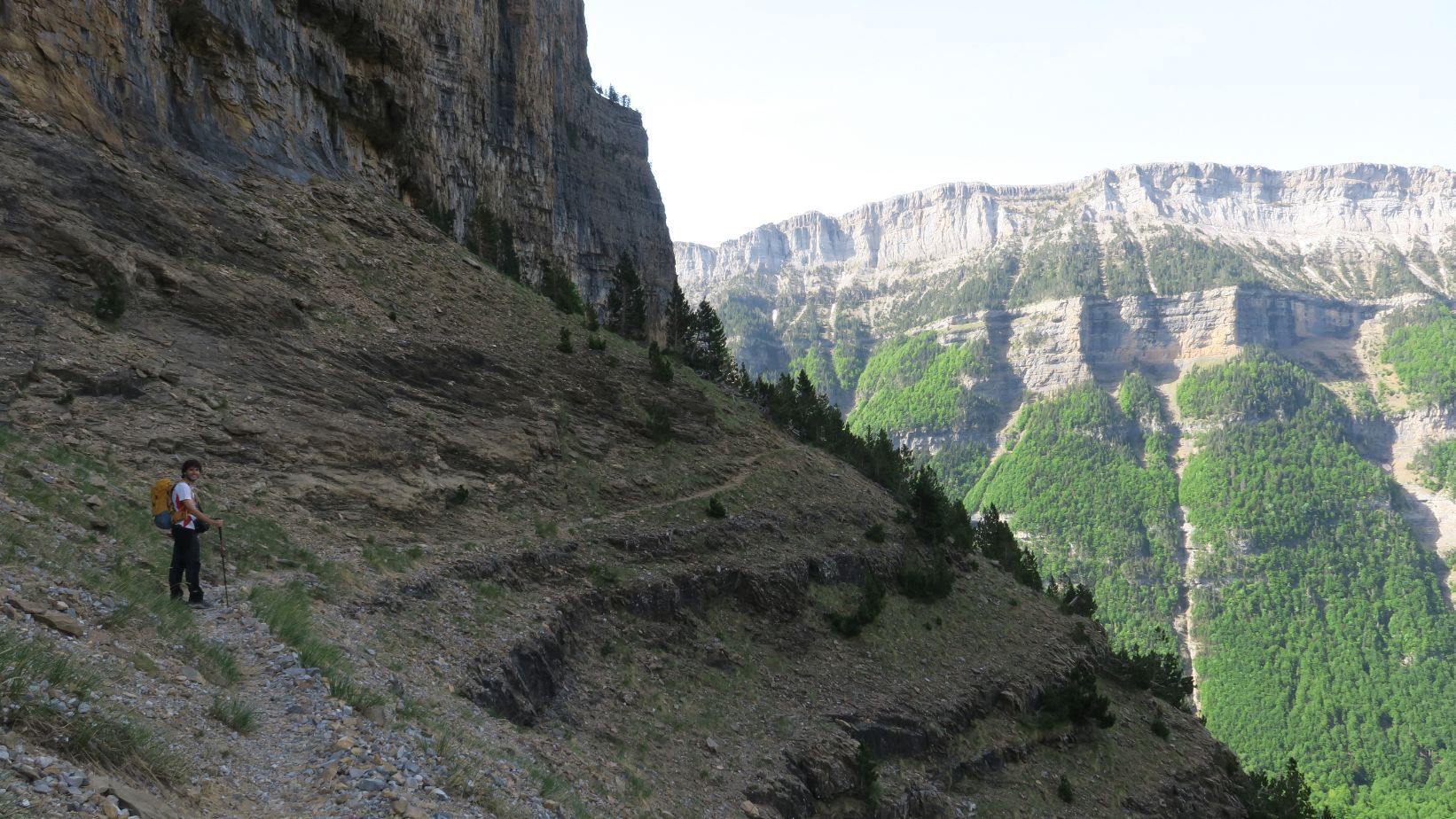 Una vez cruzado el río, la senda vuelve a ganar pendiente, y ahora con más decisión. Realiza unas pocas lazadas para rodear un espolón rocoso y situarse en su parte superior. Quizá sea este el tramo más exigente, por su pendiente, de toda la ruta. No obstante, las potentes vistas de las proas verticales de Ordesa hacen sobrellevar el esfuerzo de una manera más agradable.