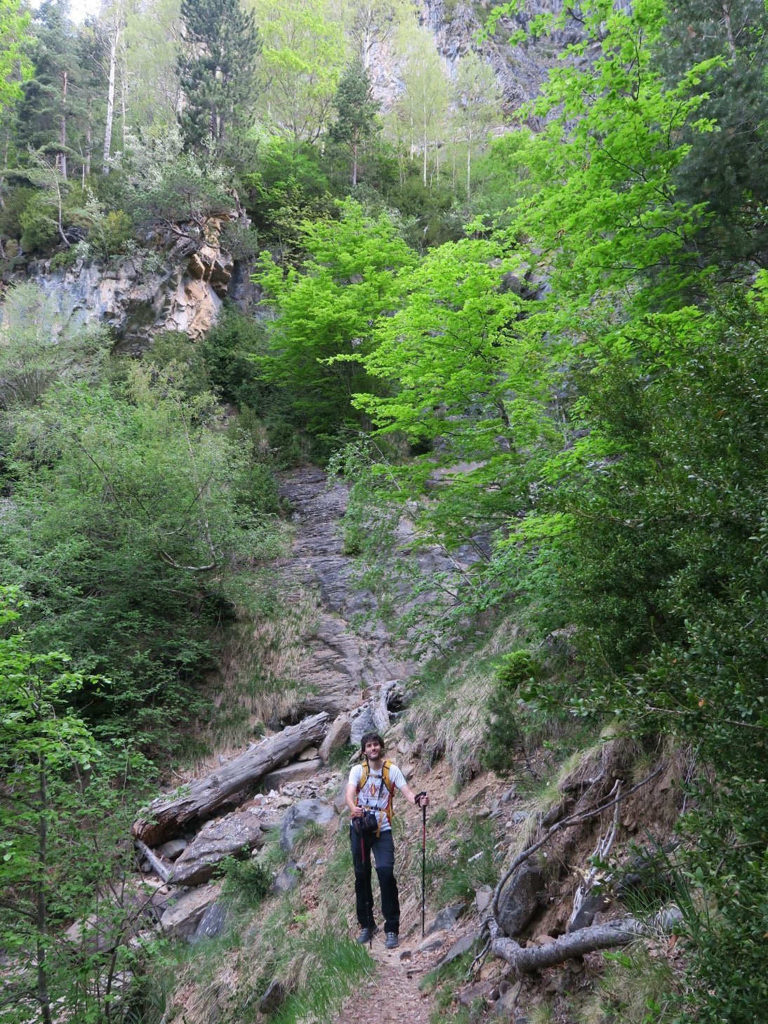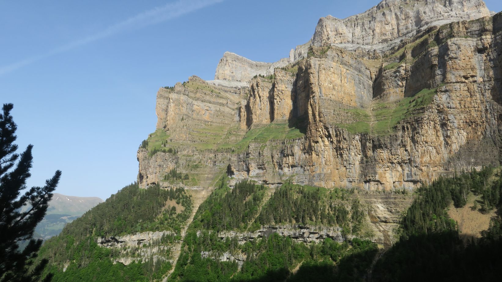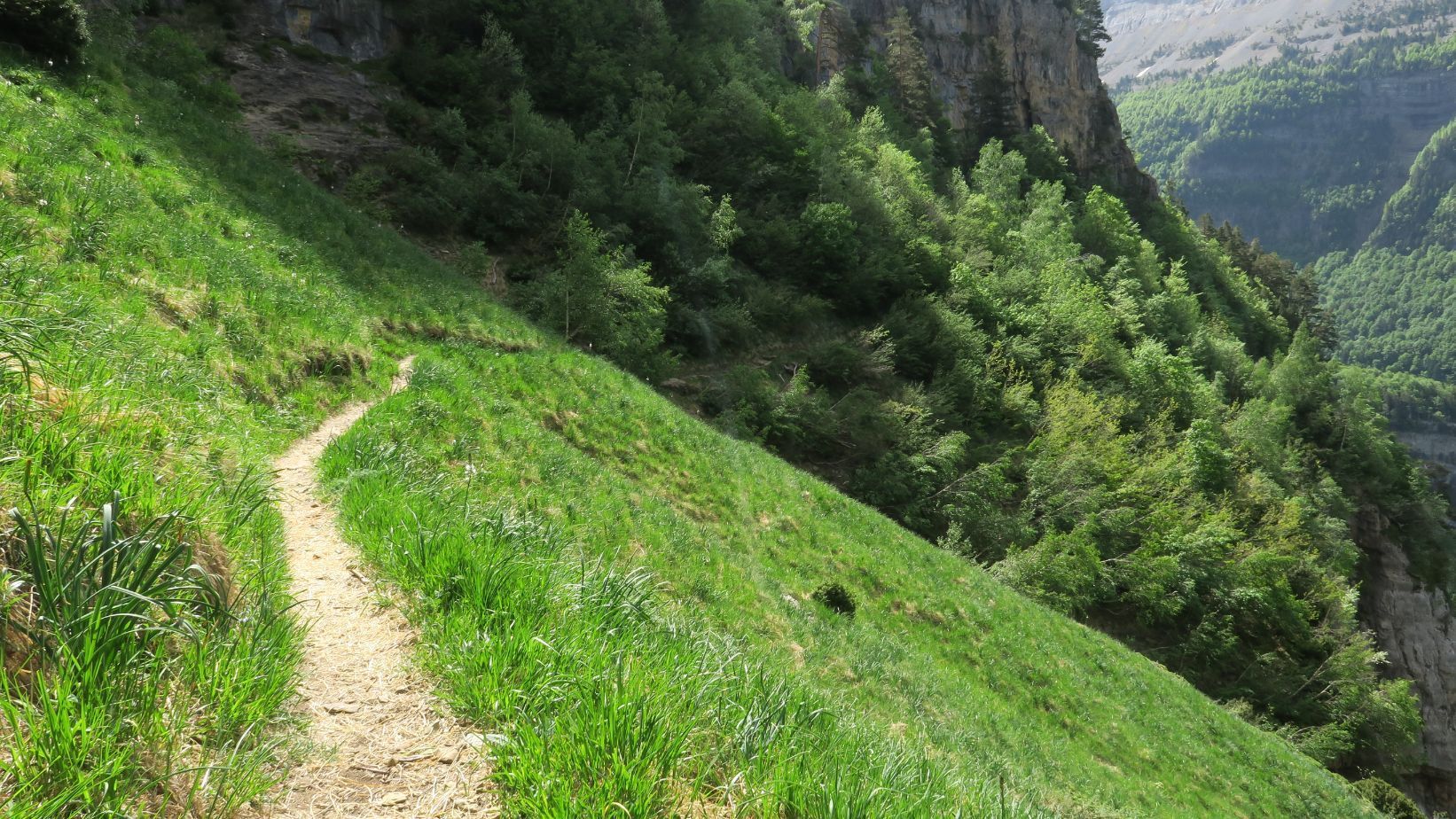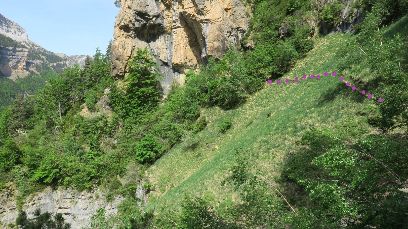 Una vez cruzado el río, la senda vuelve a ganar pendiente, y ahora con más decisión. Realiza unas pocas lazadas para rodear un espolón rocoso y situarse en su parte superior. Quizá sea este el tramo más exigente, por su pendiente, de toda la ruta. No obstante, las potentes vistas de las proas verticales de Ordesa hacen sobrellevar el esfuerzo de una manera más agradable.