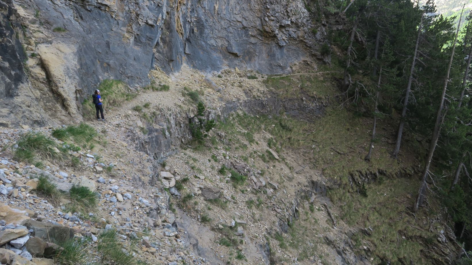 Empieza el tramo de la faja en sí, conocido en este primer tramo como Faja Petrazals. El camino es relativamente estrecho, pero con buen firme y, desde luego, sin pérdida. Aunque en todo momento a nuestra derecha hay una fuerte pendiente que finaliza en una vertical caída, la senda es lo suficientemente ancha como para no impresionar demasiado. Eso sí: despacito y buena letra de aquí en adelante.