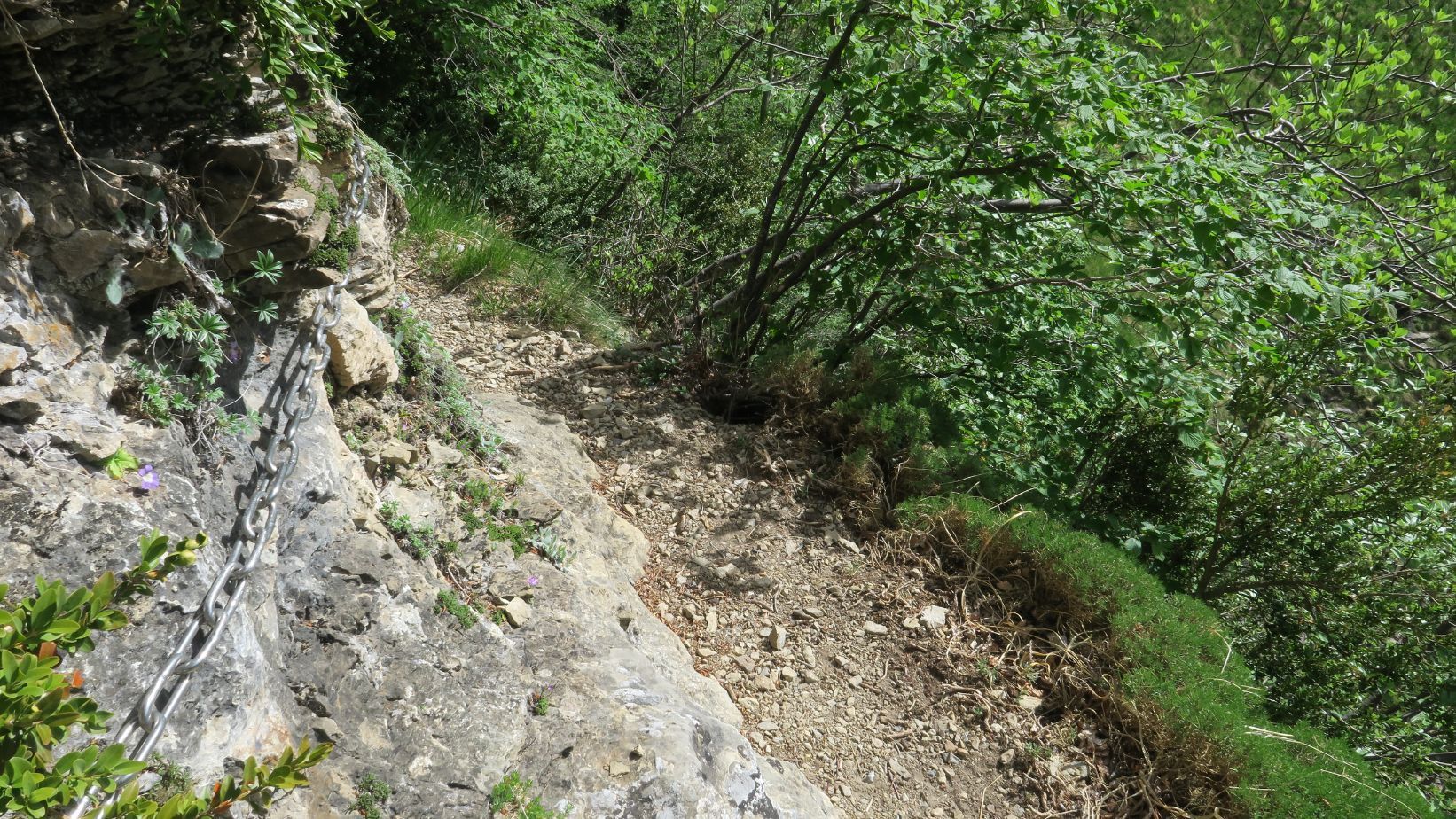 Paso equipado con la cadena. Senda estrecha pero «protegida» por los arbustos. No obstante, un metro más allá está el abismo…