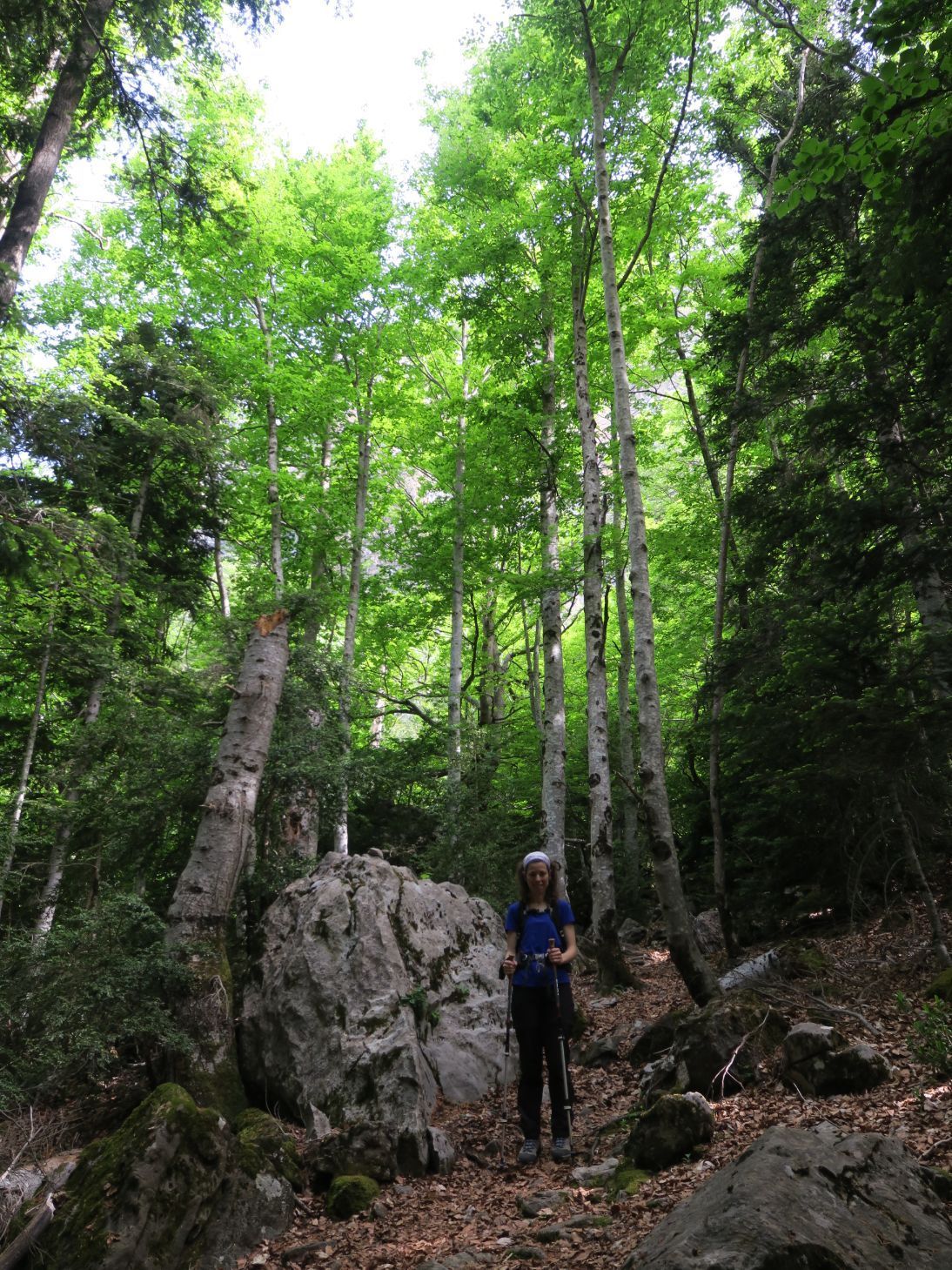 A partir de aquí el ancho camino se transforma en una senda que transcurre por bosque mixto, frondoso y sombrío. Serpentea hábilmente sorteando grandes rocas y árboles robustos, buscando la mejor manera de ganar altitud con relativa comodidad. A ritmo tranquilo, pero sin pausa, acometemos el esfuerzo.