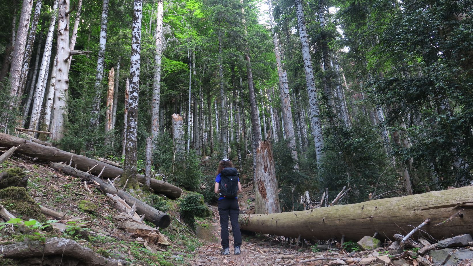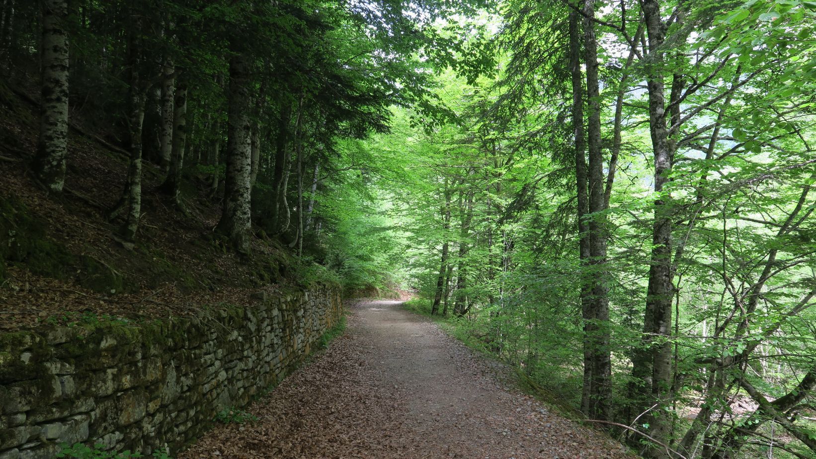 A partir de aquí finalizan las dificultades de la ruta, puesto que el camino se torna más ancho mientras se adentra, descendiendo con comodidad, en el Bosque de las Hayas. Caminamos bajo un hermoso manto verde, en una zona muy agradable de recorrer.