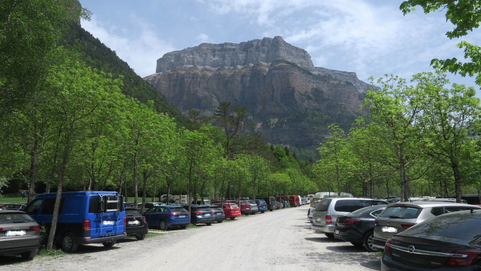 Archiconocido aparcamiento en la Pradera de Ordesa. Bajo las paredes del fondo caminaremos hoy.