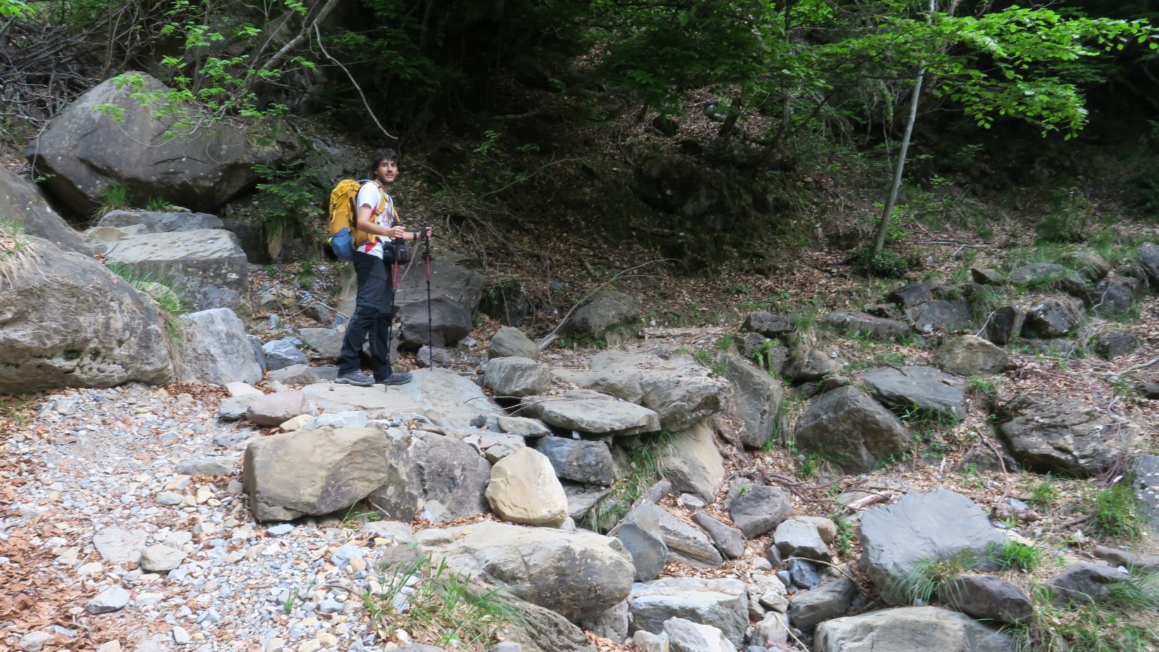 El sendero, ya algo más estrecho pero todavía sin ningún tipo de complicación, atraviesa un pequeño canchal de piedras para, poco a poco, ir encajonándose entre las verticales paredes de la Fraucata y el abismo de nuestra derecha. Desde aquí da la impresión de que no existe espacio suficiente para que un camino recorra estos verticales parajes. Ambiente, impresión y belleza a partes iguales.