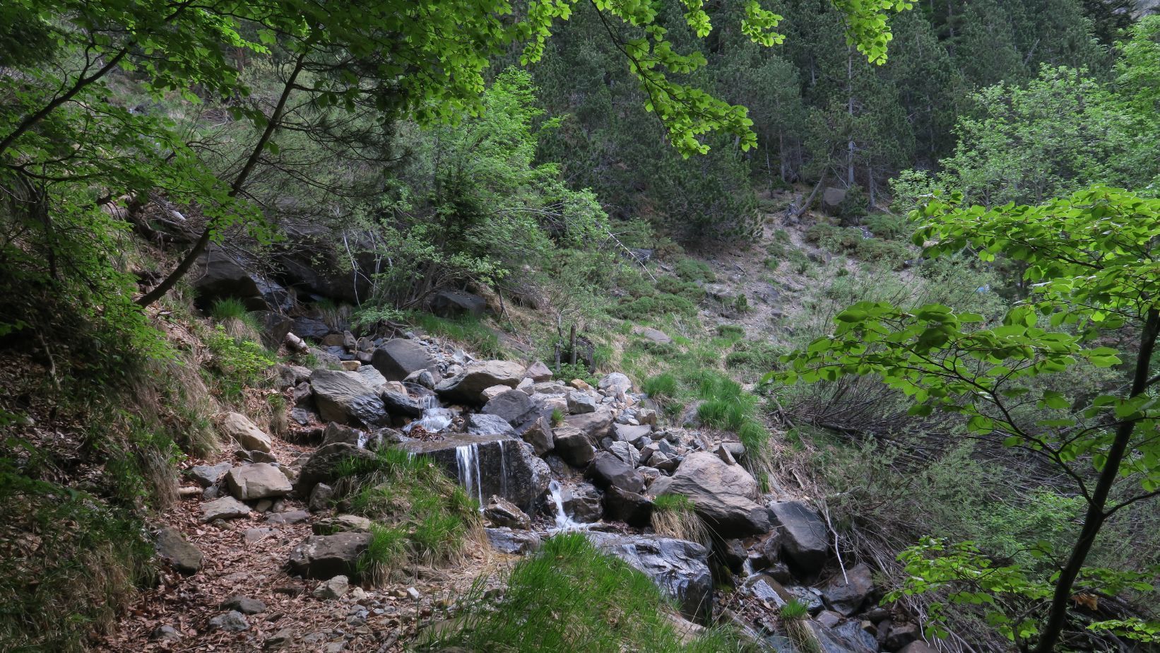 Pasamos bajo las paredes de la Fraucata, a ritmo algo más ligero puesto que impresiona de ser lugar de caída espontánea de rocas. Aunque las probabilidades de ello son bajas, llevar un casco de montaña en este punto no estaría de más.